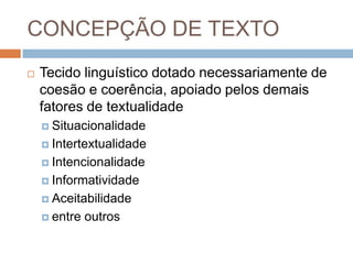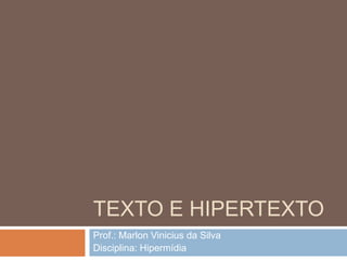 O documento discute os conceitos de texto e hipertexto. Apresenta as características de um texto, como coesão e coerência. Explica o que pode impedir a circulação de um texto, como restrições intelectuais, materiais e políticas. Introduz o conceito de hipertexto e seus elementos, como nós e links. Aponta os principais tipos de percursos em um hipertexto.