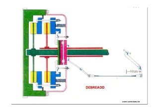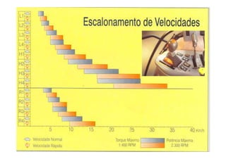 O documento discute sistemas de transmissão em tratores, incluindo conceitos como torque, potência, força e trabalhos. Explica os principais componentes de uma transmissão de trator, como embreagem, caixa de marchas, diferencial e tomada de potência. Também aborda os tipos de transmissão e a evolução histórica dos tratores.