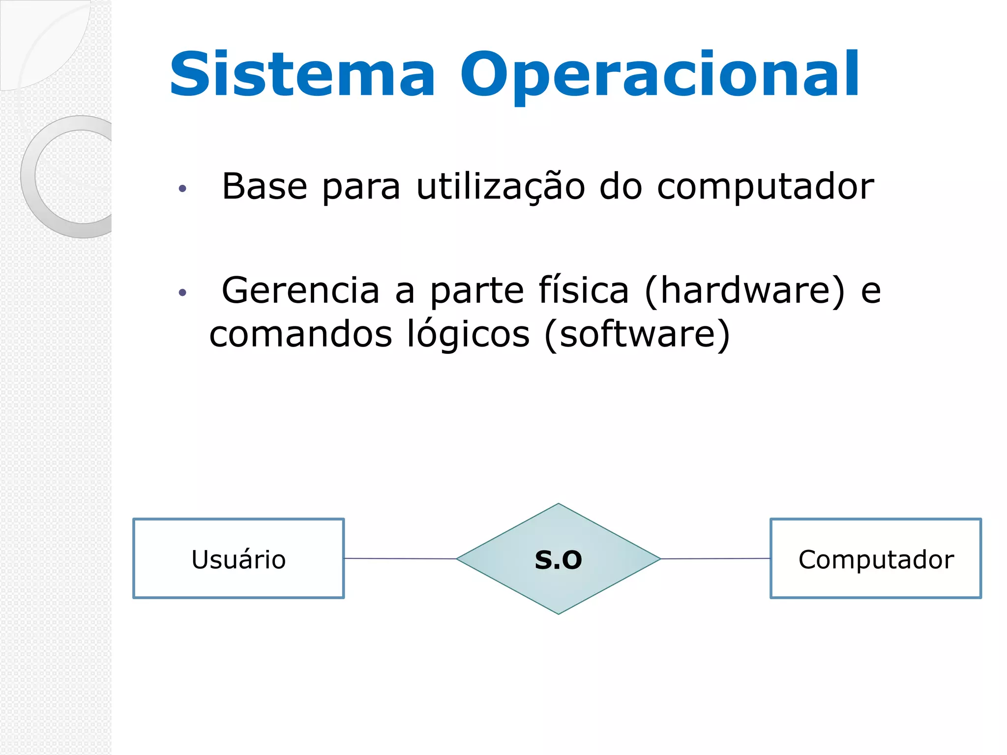 O documento descreve as funções básicas de um sistema operacional, incluindo gerenciar hardware e software, organizar arquivos e pastas, e fornecer ferramentas como editor de texto, planilhas, cálculos e edição de imagens. Ele também mostra estatísticas sobre sistemas operacionais populares e como personalizar configurações.