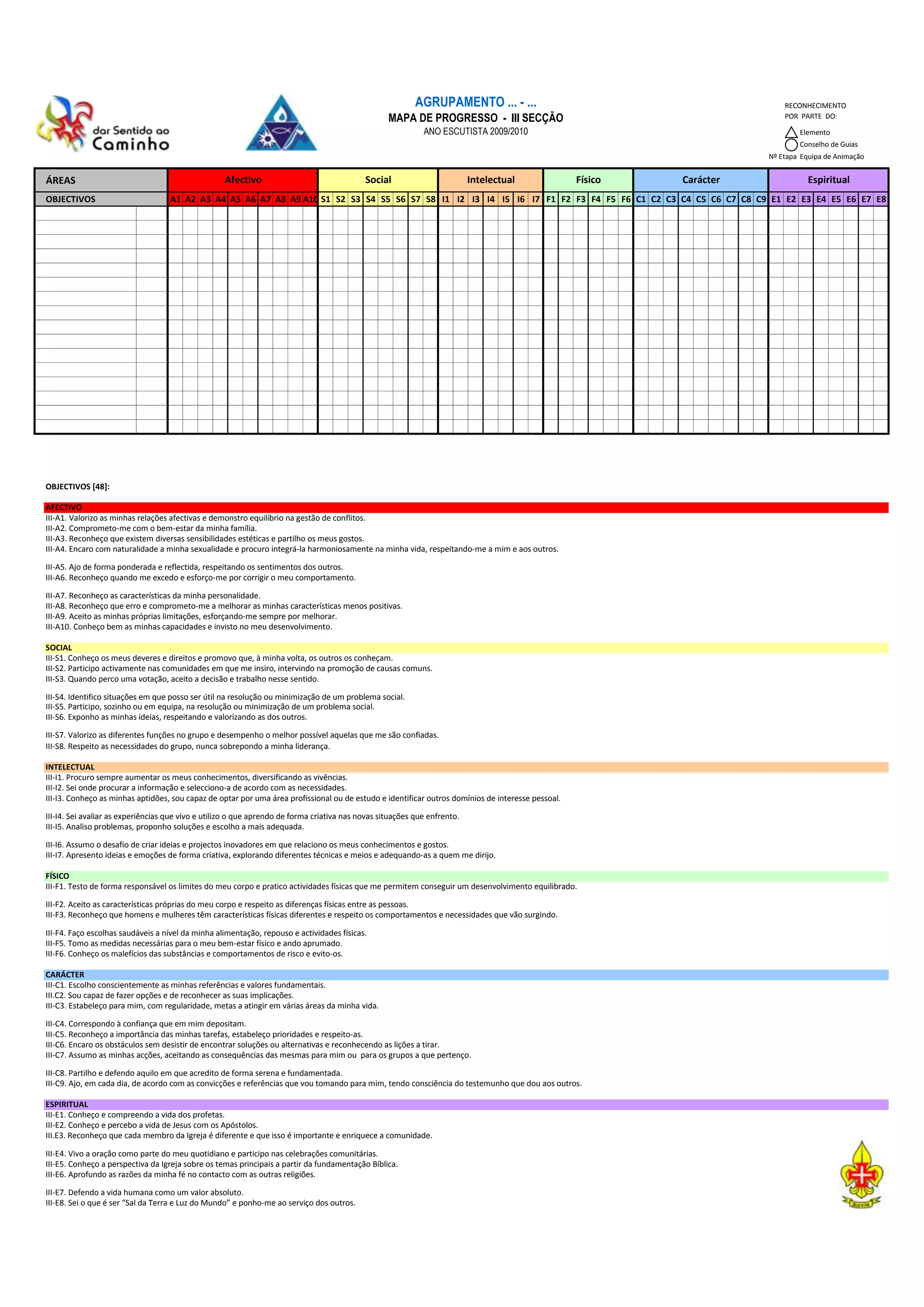 Este documento apresenta os objetivos de desenvolvimento para alunos da 3a secção em várias áreas, incluindo afetiva, social, intelectual, física, de caráter e espiritual. Lista 48 objetivos específicos relacionados a esses domínios, como valorizar relações afetivas, participar ativamente na comunidade, aumentar conhecimentos, fazer escolhas saudáveis, estabelecer metas pessoais e aprofundar a compreensão da fé.