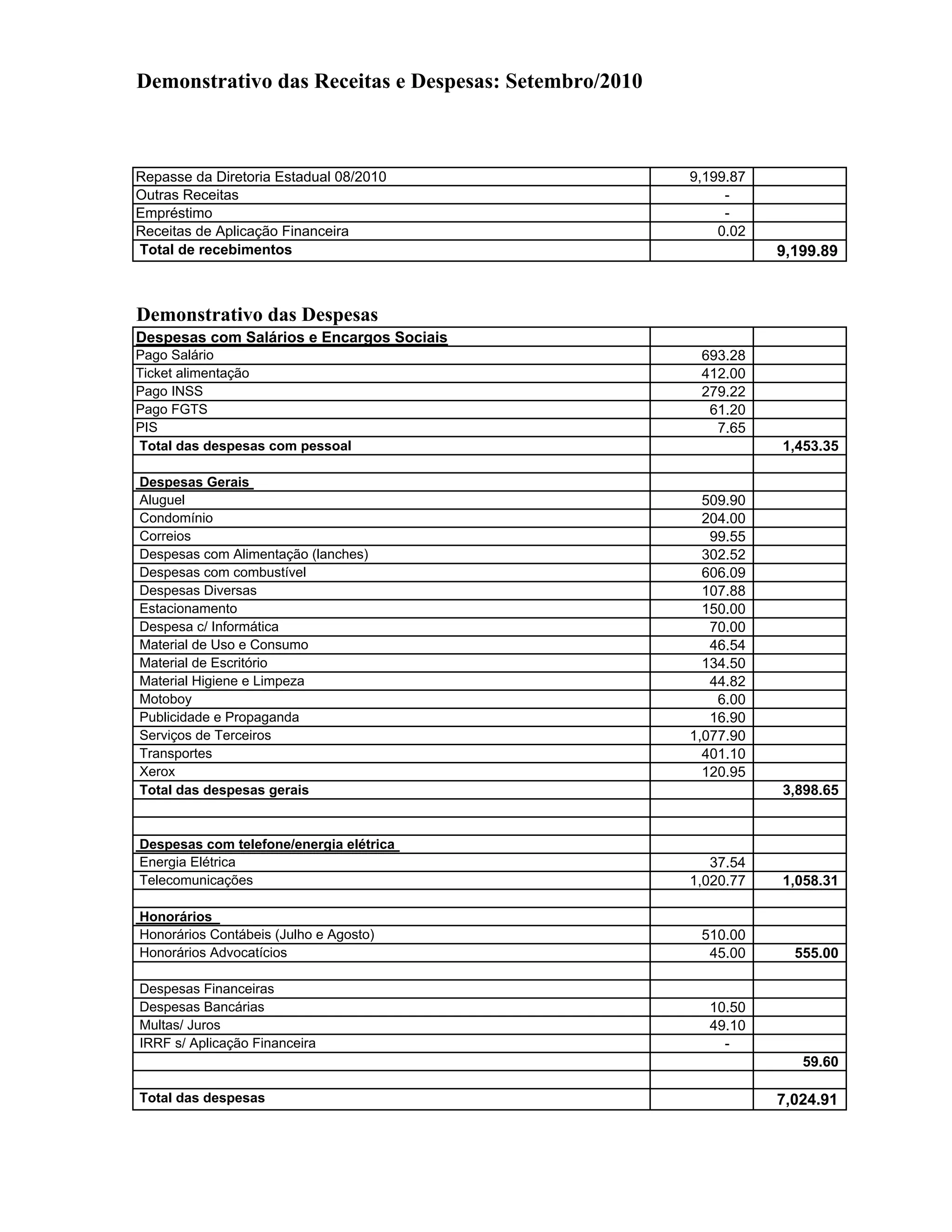 O relatório mostra as receitas e despesas de setembro de 2010, com um total de recebimento de R$9.199,89 e despesas de R$7.024,91. As maiores despesas foram com salários, serviços terceirizados, telecomunicações e energia elétrica. O saldo final em conta bancária e caixa foi de R$3.999,56.