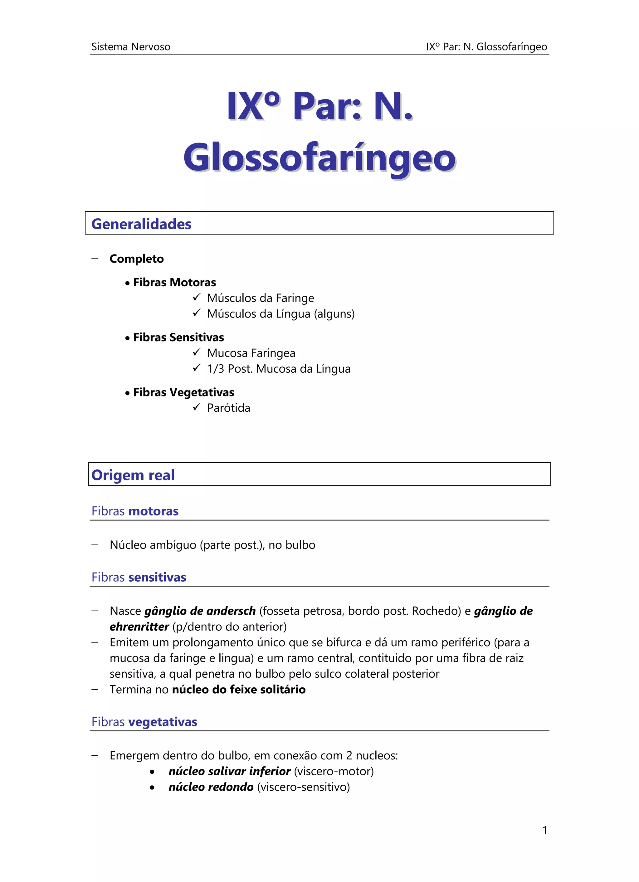 O nervo glossofaríngeo origina-se no bulbo e fornece fibras motoras para músculos da faringe e língua, fibras sensitivas para a mucosa faríngea e parte posterior da língua, e fibras vegetativas para a parótida. Ele emerge no sulco colateral posterior do bulbo e sai pelo buraco lácero posterior, dirigindo-se para a base da língua, onde se ramifica.