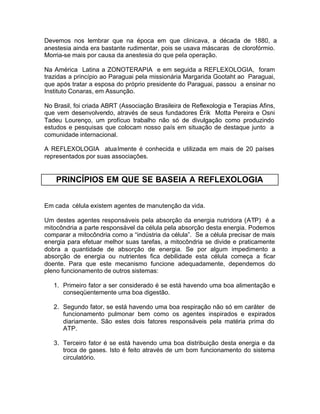 O documento descreve a história e os princípios da reflexologia. Começou no Oriente e foi desenvolvida na Europa e América no início do século 20. Baseia-se na ideia de que as áreas dos pés e mãos refletem diferentes partes do corpo e estimular essas áreas pode aliviar problemas de saúde.