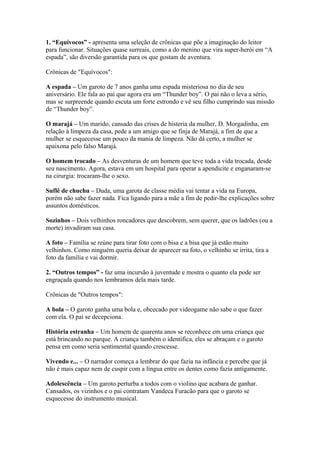 O documento apresenta uma seleção de crônicas de três livros diferentes: "Equívocos", "Outros tempos" e "De olho na linguagem". As crônicas abordam temas como situações surreais e divertidas, lembranças da juventude e brincadeiras com a língua portuguesa. Algumas das crônicas resumidas são "A espada", "História estranha" e "Sexa".