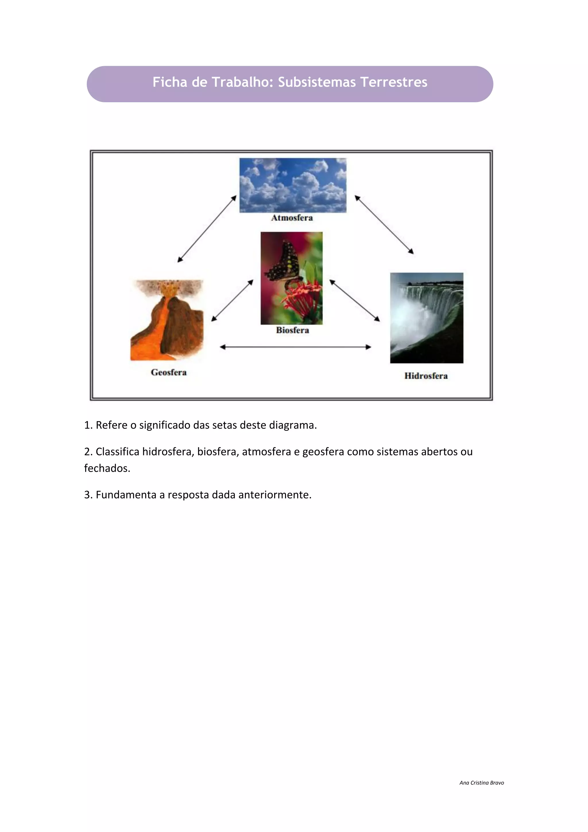 O documento discute os subsistemas terrestres, incluindo hidrosfera, biosfera, atmosfera e geosfera. Classifica os sistemas como abertos ou fechados e explica a classificação de cada um com base na troca de matéria e energia com o ambiente externo.