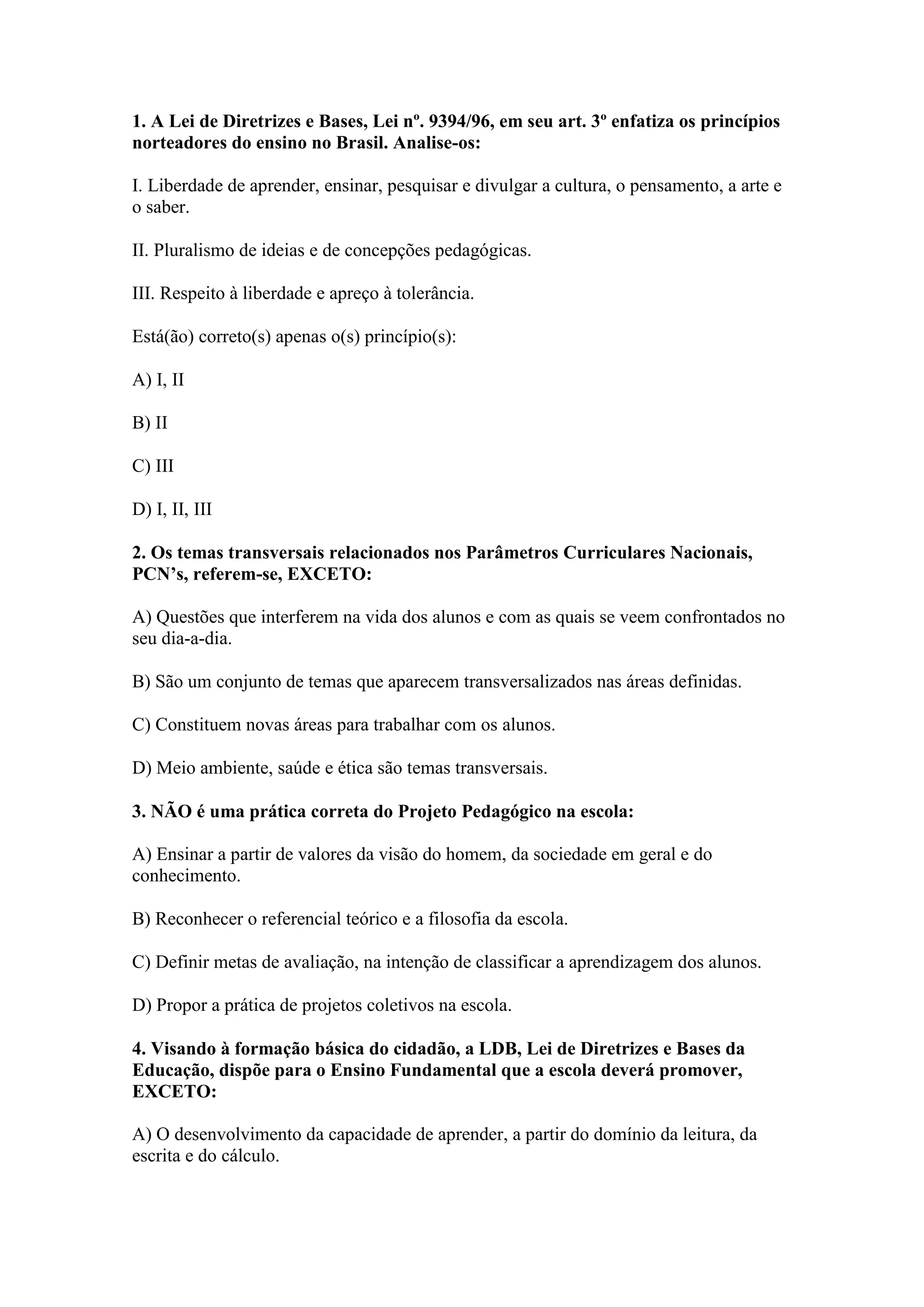 O documento discute os princípios norteadores do ensino no Brasil segundo a Lei de Diretrizes e Bases, afirmando que os princípios de liberdade de aprender, ensinar e pesquisar; pluralismo de ideias; e respeito à liberdade e tolerância estão corretos. Além disso, aborda os temas transversais dos Parâmetros Curriculares Nacionais e a avaliação do aproveitamento escolar.