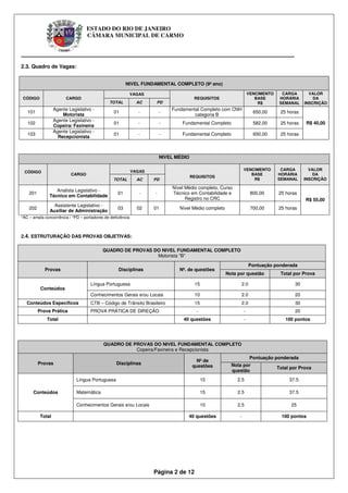 Este documento descreve um edital de concurso público para a Câmara Municipal de Carmo no Rio de Janeiro para preenchimento de vagas de nível fundamental e médio. O concurso consistirá em provas objetivas e, para motorista, uma prova prática de direção. Há vagas para motorista, copeira/faxineira, recepcionista, técnico em contabilidade e auxiliar administrativo.