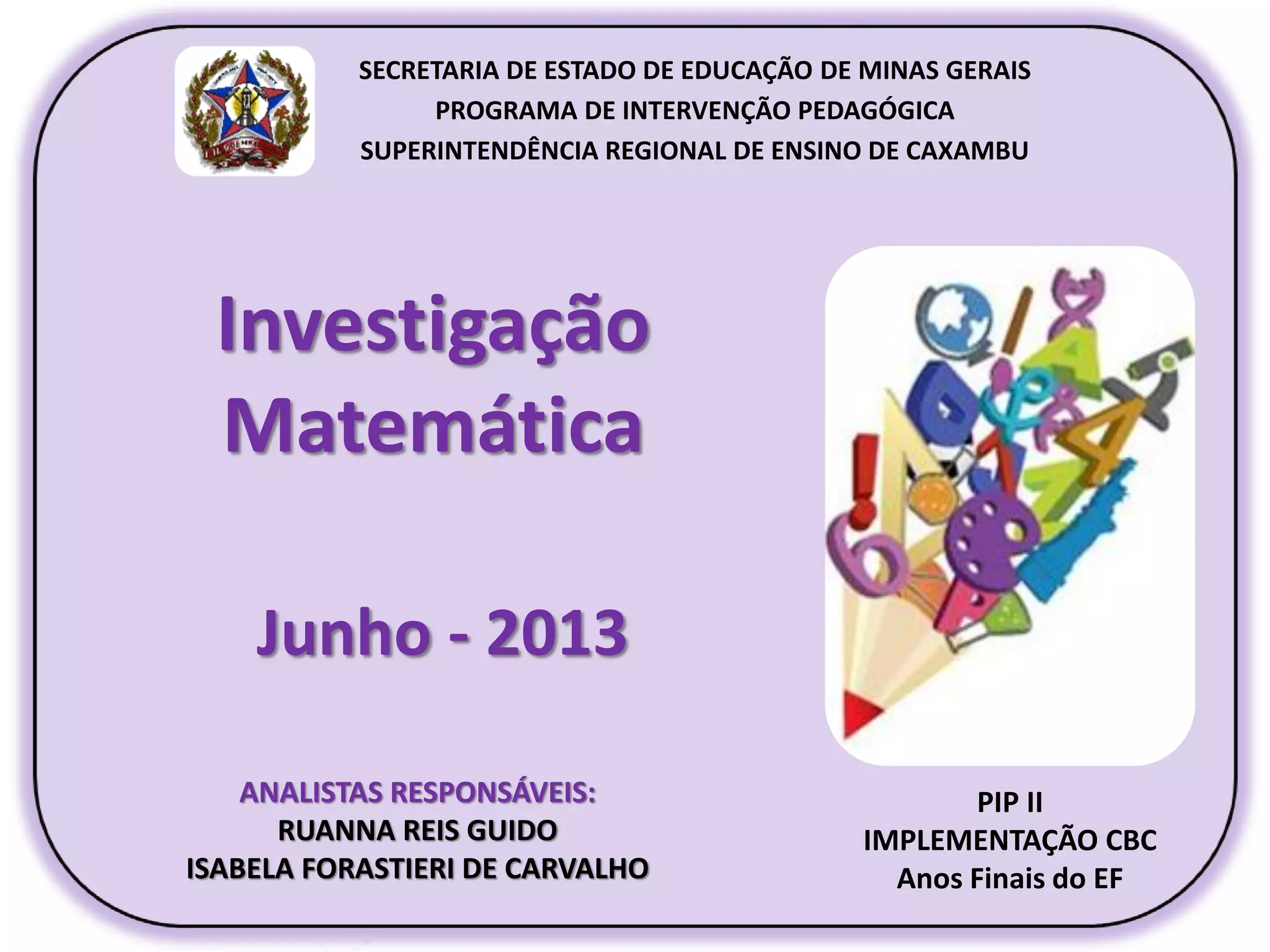1) O documento discute a implementação de atividades investigativas nos anos finais do ensino fundamental para desenvolver habilidades de compreensão e promover a autonomia dos alunos em matemática.