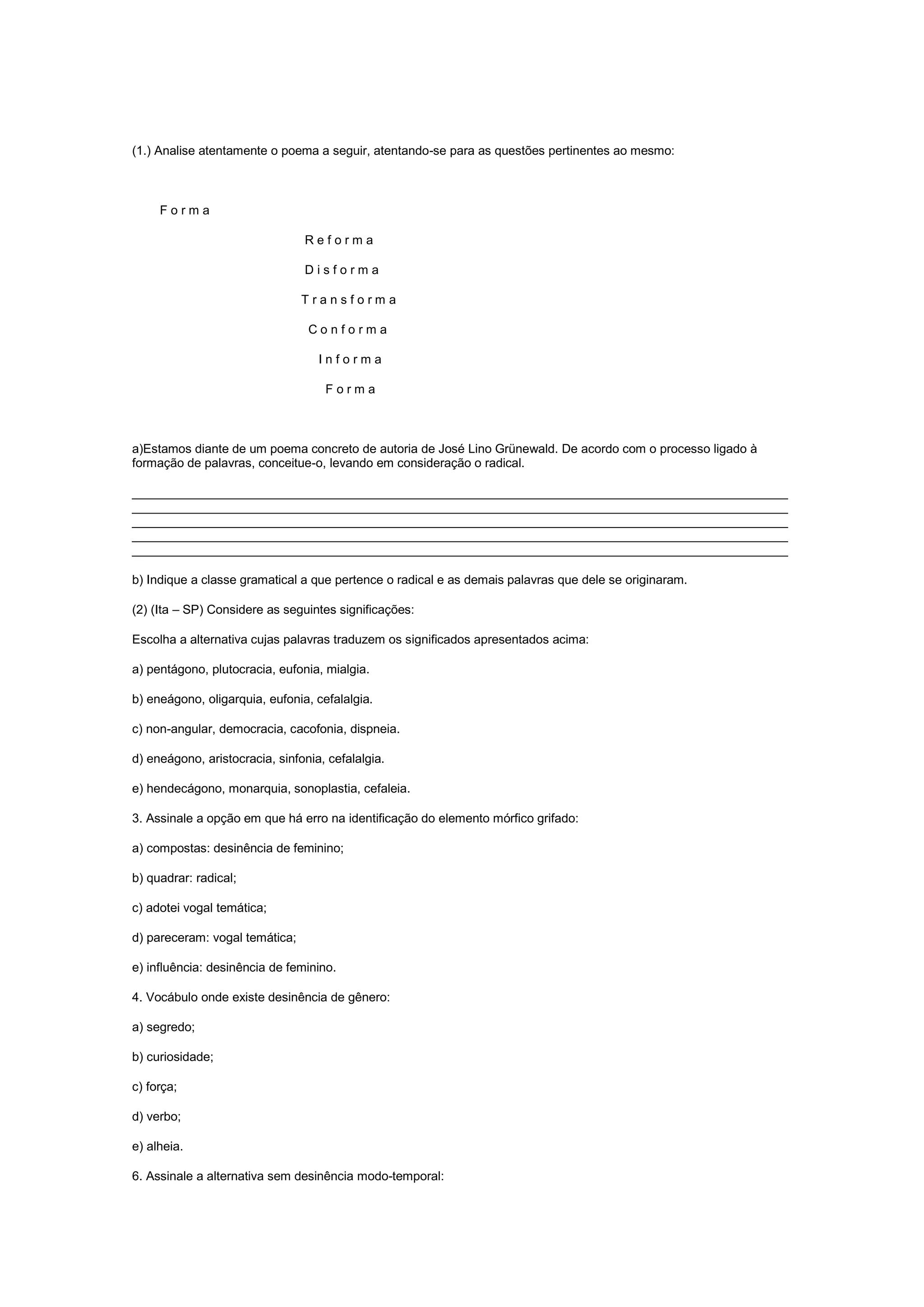 1) O poema apresenta um processo de formação de palavras por derivação prefixal e sufixal. O radical é "form".
