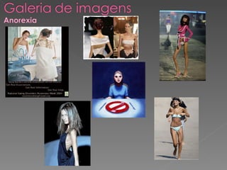 1) O documento descreve sintomas de distúrbios alimentares como a anorexia e a bulimia nervosa, incluindo distorção corporal, depressão, isolamento social e obsessão por comida e calorias.