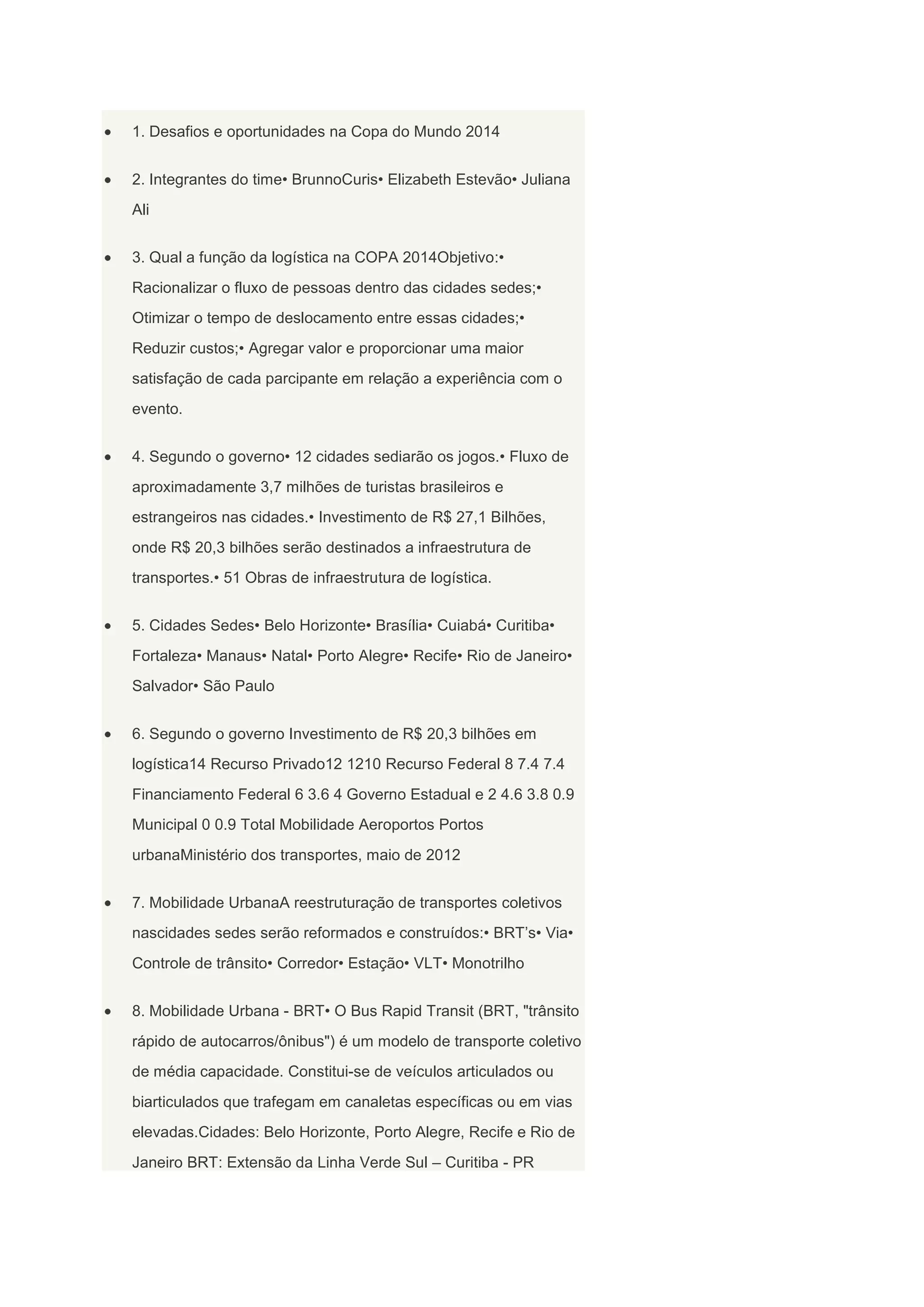 O documento discute os desafios logísticos da Copa do Mundo de 2014 no Brasil, com investimentos de R$27 bilhões em transporte e mobilidade urbana para 12 cidades sedes, incluindo novos sistemas BRT, VLT, corredores e melhorias aeroportuárias e portuárias, apesar de 14 obras estarem atrasadas.