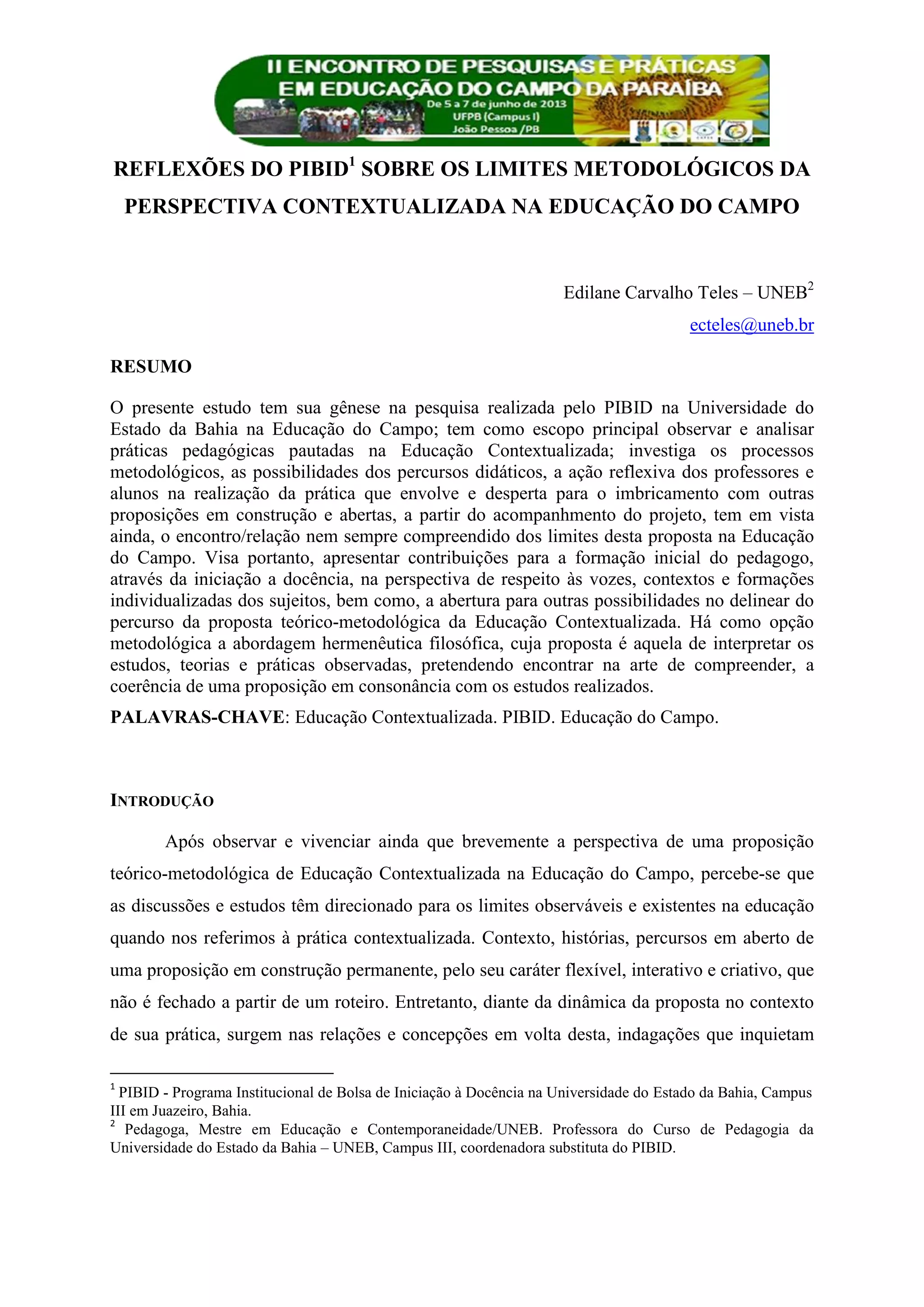 Este documento discute os limites metodológicos da educação contextualizada na educação do campo a partir da experiência do PIBID na UNEB. Ele reflete sobre a possibilidade de definir um percurso metodológico coerente para a educação contextualizada e aponta a importância do diálogo entre universidade, escola e comunidade para o desenvolvimento dessa abordagem pedagógica.