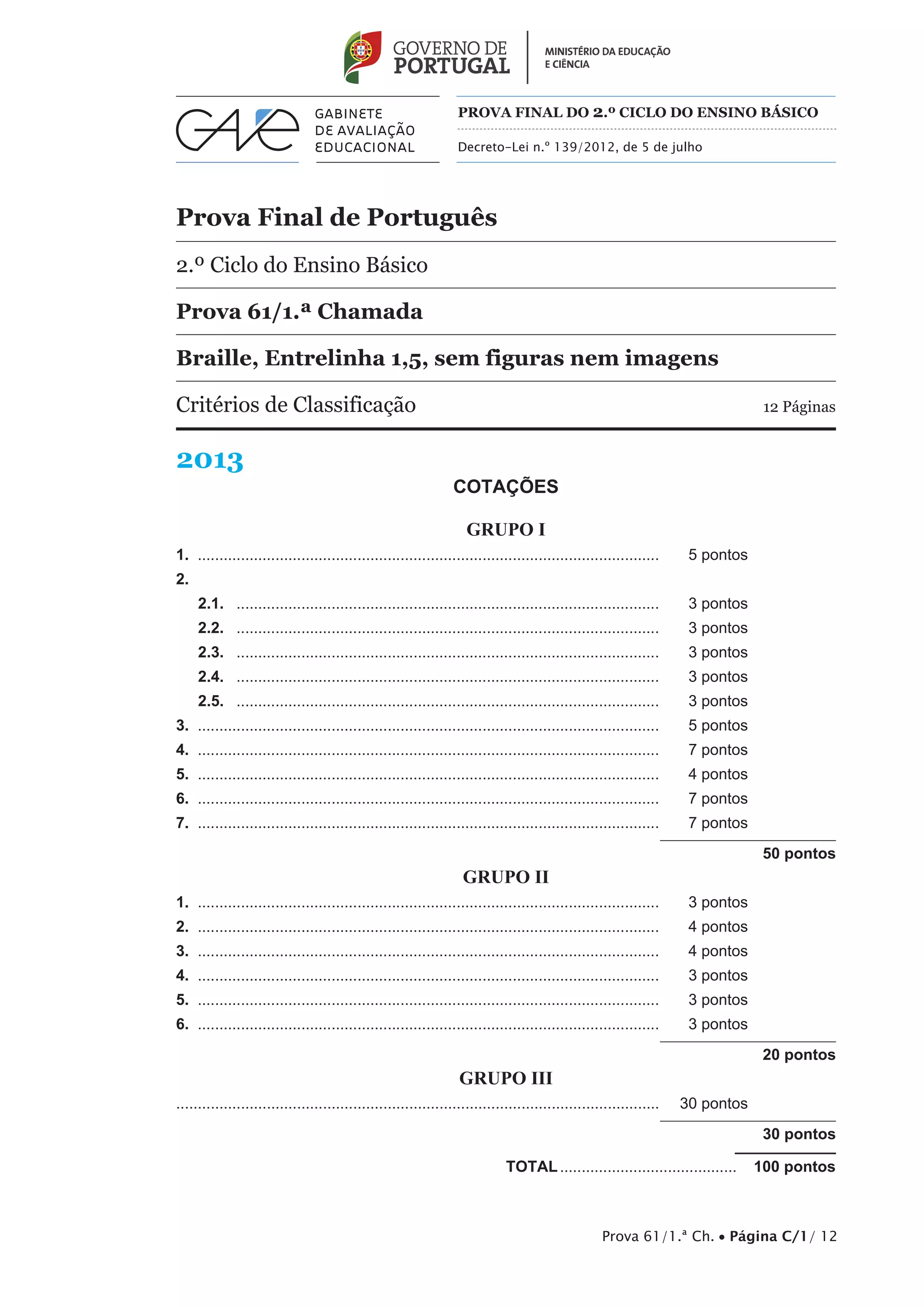Este documento fornece os critérios de classificação para uma prova final do 2o ciclo do ensino básico em Português. Contém três grupos de itens avaliados, com diferentes tipos de questões e níveis de desempenho. Fornece detalhes sobre como classificar as respostas dos alunos de acordo com os erros e o conteúdo fornecido. A pontuação total da prova é de 100 pontos.