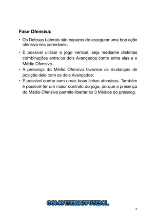 O documento descreve o sistema tático 1-4-3-1-2 de Carlo Ancelotti, destacando que na fase defensiva os laterais e médios podem cobrir os corredores, mas requer um comportamento mais esperado devido à distância entre os médios. Na fase ofensiva, os laterais apoiam o ataque pelos corredores, há possibilidades de jogo vertical, e o meia ofensivo ajuda nas trocas de posição e no controle de bola.