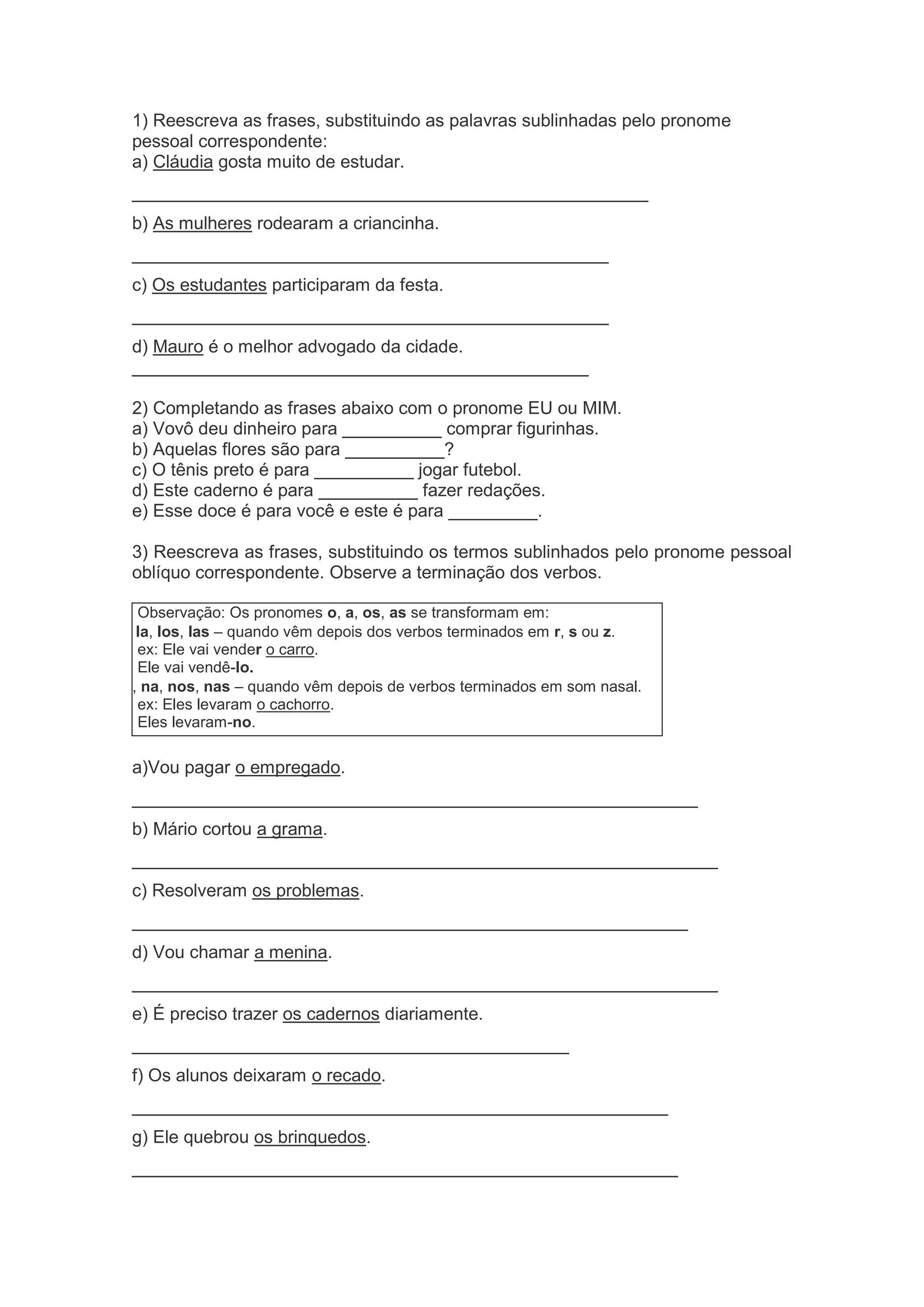 O documento apresenta exercícios sobre pronomes pessoais, demonstrativos, possessivos, interrogativos e de tratamento. Nos exercícios, pede-se para reescrever frases substituindo termos por pronomes correspondentes e escolher o pronome que preenche corretamente lacunas em frases dadas.