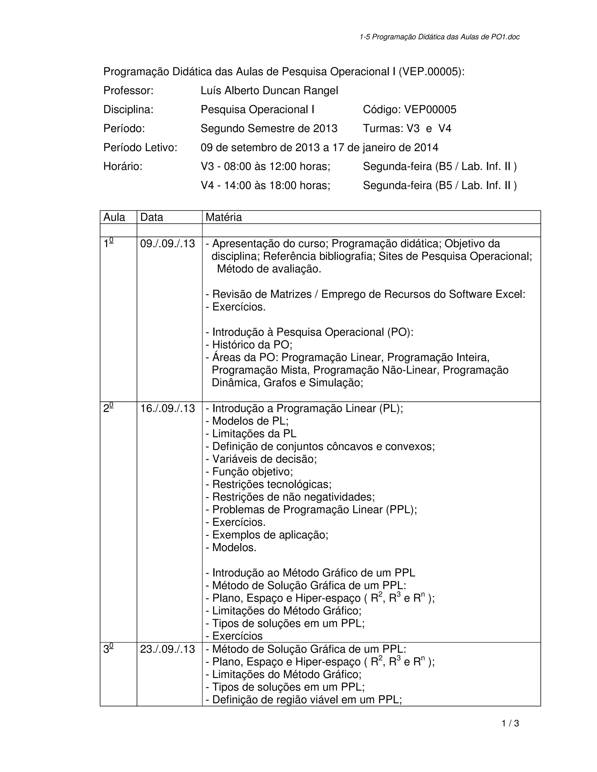 Este documento apresenta a programação didática das aulas da disciplina de Pesquisa Operacional I ministrada pelo professor Luís Alberto Duncan Rangel no segundo semestre de 2013. A disciplina abordará temas como introdução à pesquisa operacional, programação linear, método gráfico, método simplex, dualidade, análise de sensibilidade e modelos como programação de corte e problemas de transporte. Serão realizadas duas avaliações parciais e uma verificação suplementar.