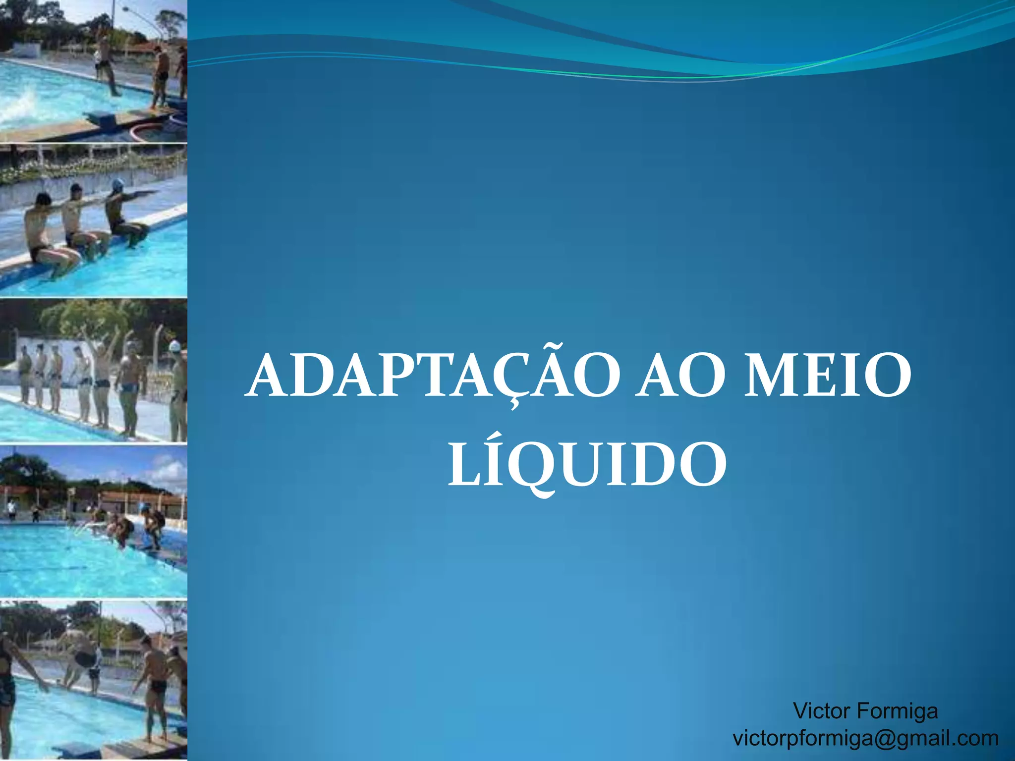 ADAPTAÇÃO AO MEIOLÍQUIDOImportante a presença do responsável da criança, para que assim esta tenha um primeiro contato prazeroso com a água.Explorar o contato aquático de forma lúdica e quando o professor perceber que esta no momento certo.Victor Formigavictorpformiga@gmail.com