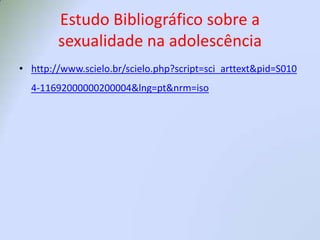 O documento discute a sexualidade humana, especificamente durante a adolescência. Aborda o que é a sexualidade e como ela muda durante a adolescência, influenciada pelo instinto de reprodução. Também define orientação sexual como atração por pessoas do mesmo sexo, sexo oposto ou ambos, e como esta é determinada por fatores biológicos ao invés de escolha. Por fim, fornece um link para um estudo sobre o tema.