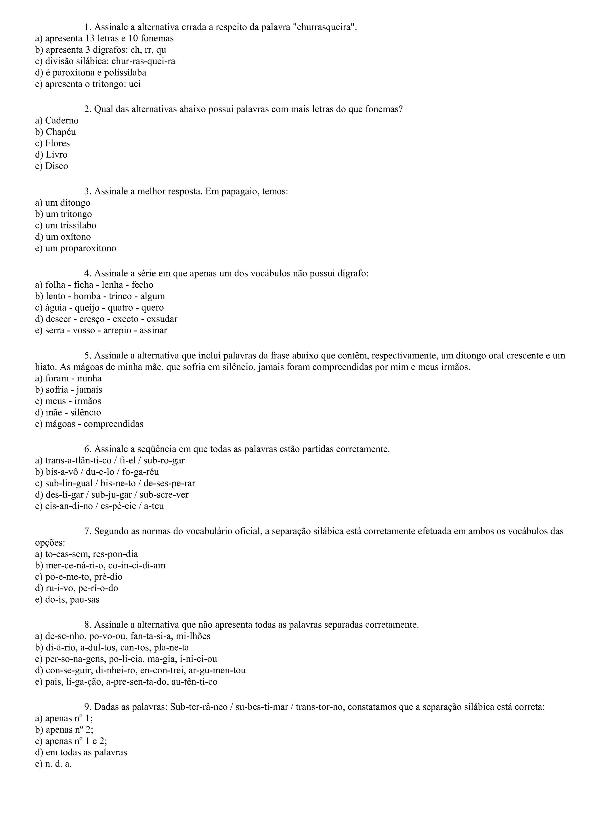1. O documento contém 27 questões sobre fonemas, ditongos, hiatos e divisão silábica de palavras.