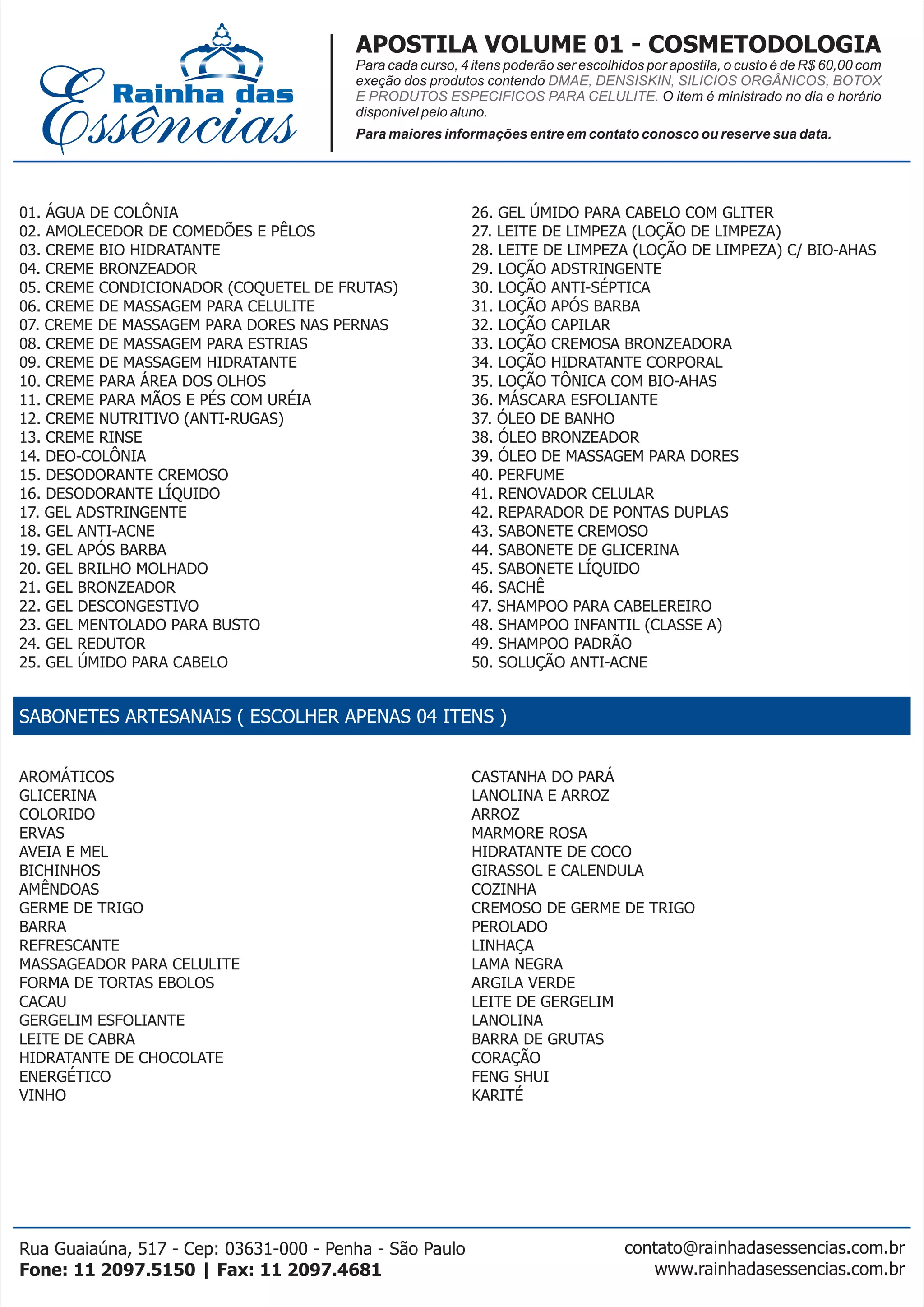 Este documento é um catálogo de produtos cosméticos oferecidos por uma empresa, incluindo itens como cremes, loções, óleos, sabonetes e xampus. O documento lista 50 produtos cosméticos e vários tipos de sabonetes artesanais que os alunos podem escolher durante os cursos de cosmética da empresa.