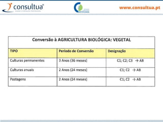Este documento fornece orientações sobre a conversão para a agricultura biológica. Discute a importância de (1) compreender o funcionamento dos agro-sistemas, (2) manter a fertilidade e atividade biológica do solo, e (3) incrementar a diversidade vegetal e animal.
