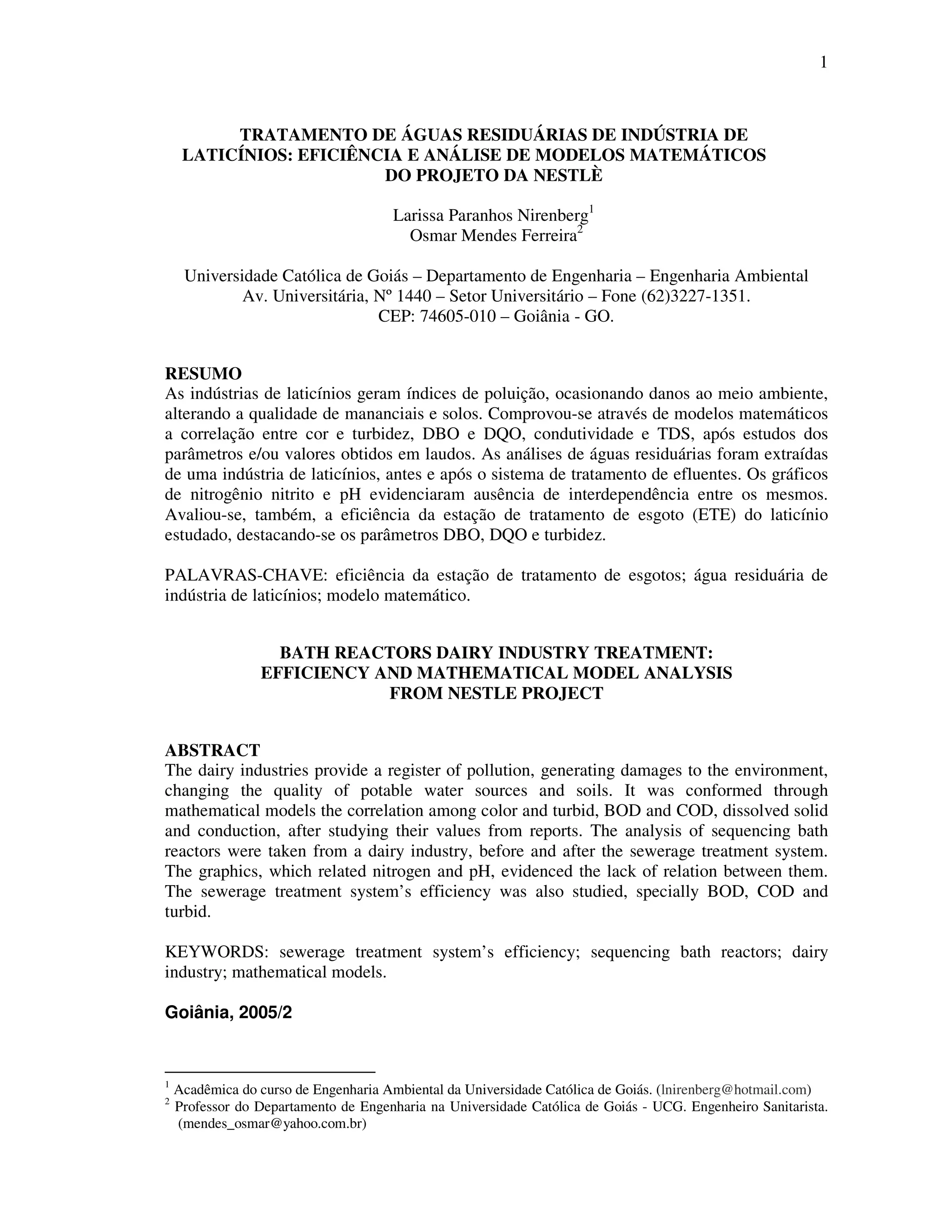 1) O documento analisa a eficiência do sistema de tratamento de efluentes de uma indústria de laticínios e os parâmetros físico-químicos antes e depois do tratamento.