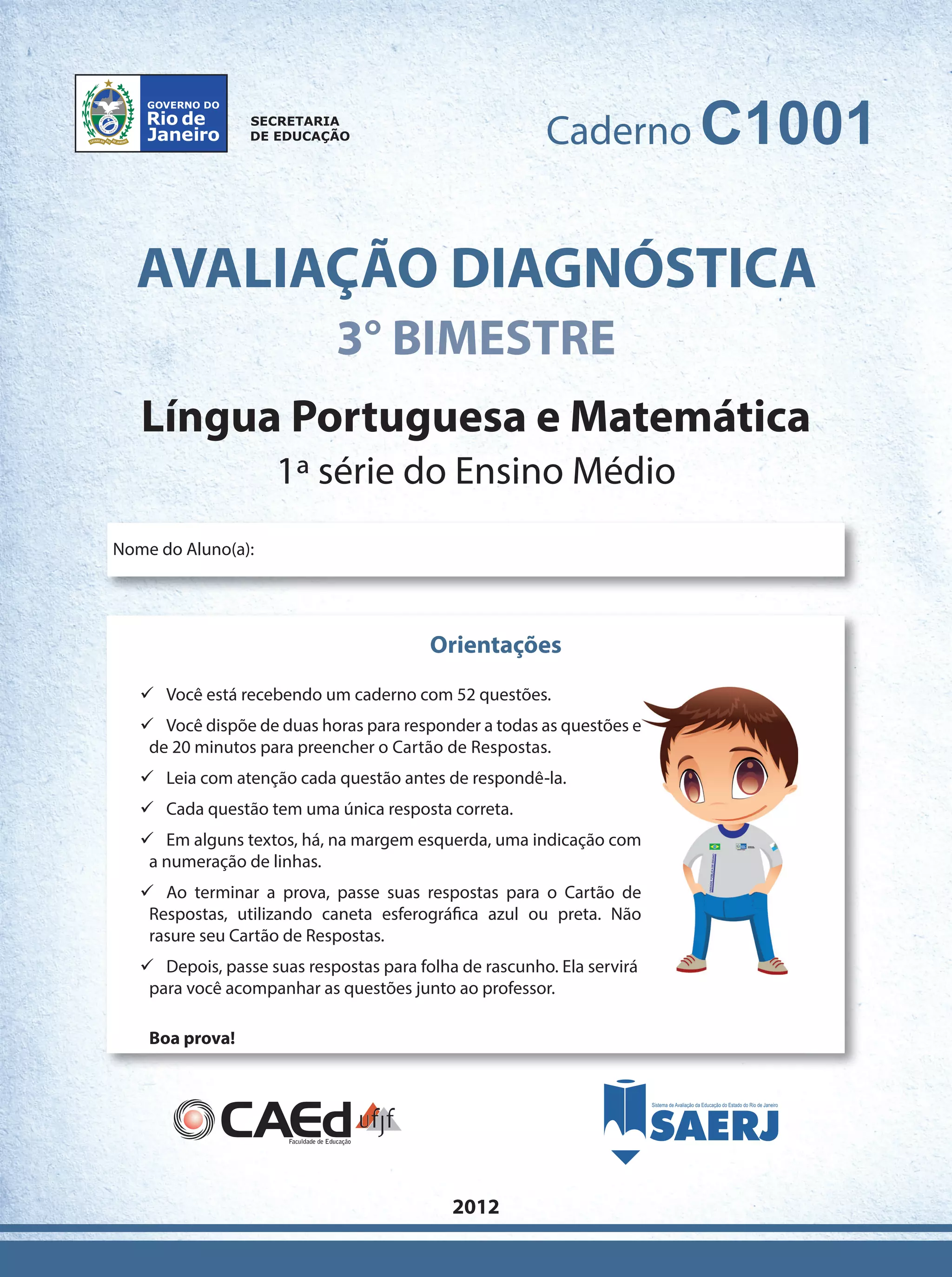 CadernoC1001 AVALIAÇÃO DIAGNÓSTICA 3° BIMESTRE Língua Portuguesa e Matemática 1ª série do Ensino Médio 2012 Nome do Aluno(a): Orientações  Você está recebendo um caderno com 52 questões.  Você dispõe de duas horas para responder a todas as questões e de 20 minutos para preencher o Cartão de Respostas.  Leia com atenção cada questão antes de respondê-la.  Cada questão tem uma única resposta correta.  Em alguns textos, há, na margem esquerda, uma indicação com a numeração de linhas.  Ao terminar a prova, passe suas respostas para o Cartão de Respostas, utilizando caneta esferográfi ca azul ou preta. Não rasure seu Cartão de Respostas.  Depois, passe suas respostas para folha de rascunho. Ela servirá para você acompanhar as questões junto ao professor. Boa prova!