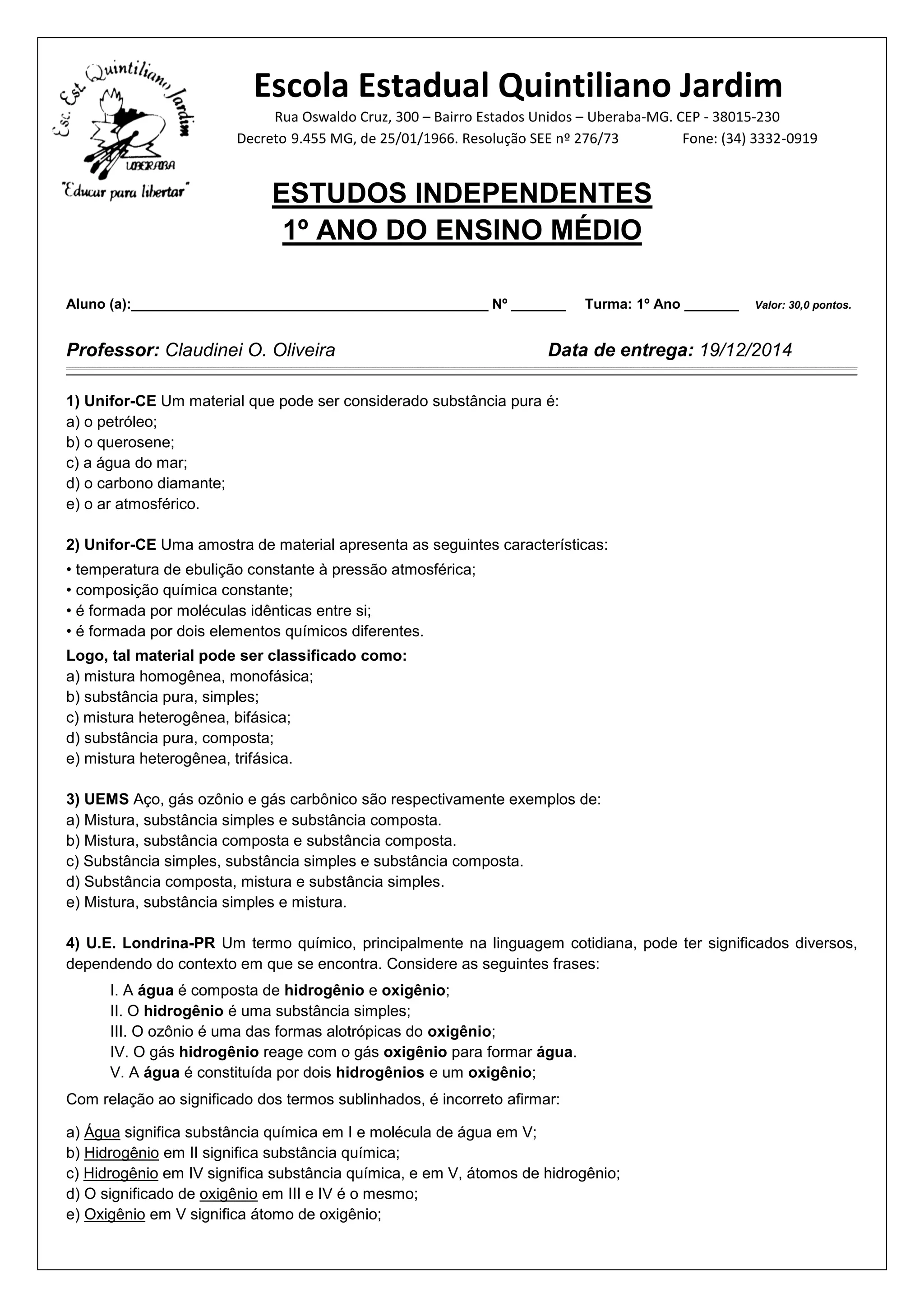 Professor: Claudinei O. Oliveira Data de entrega: 19/12/2014