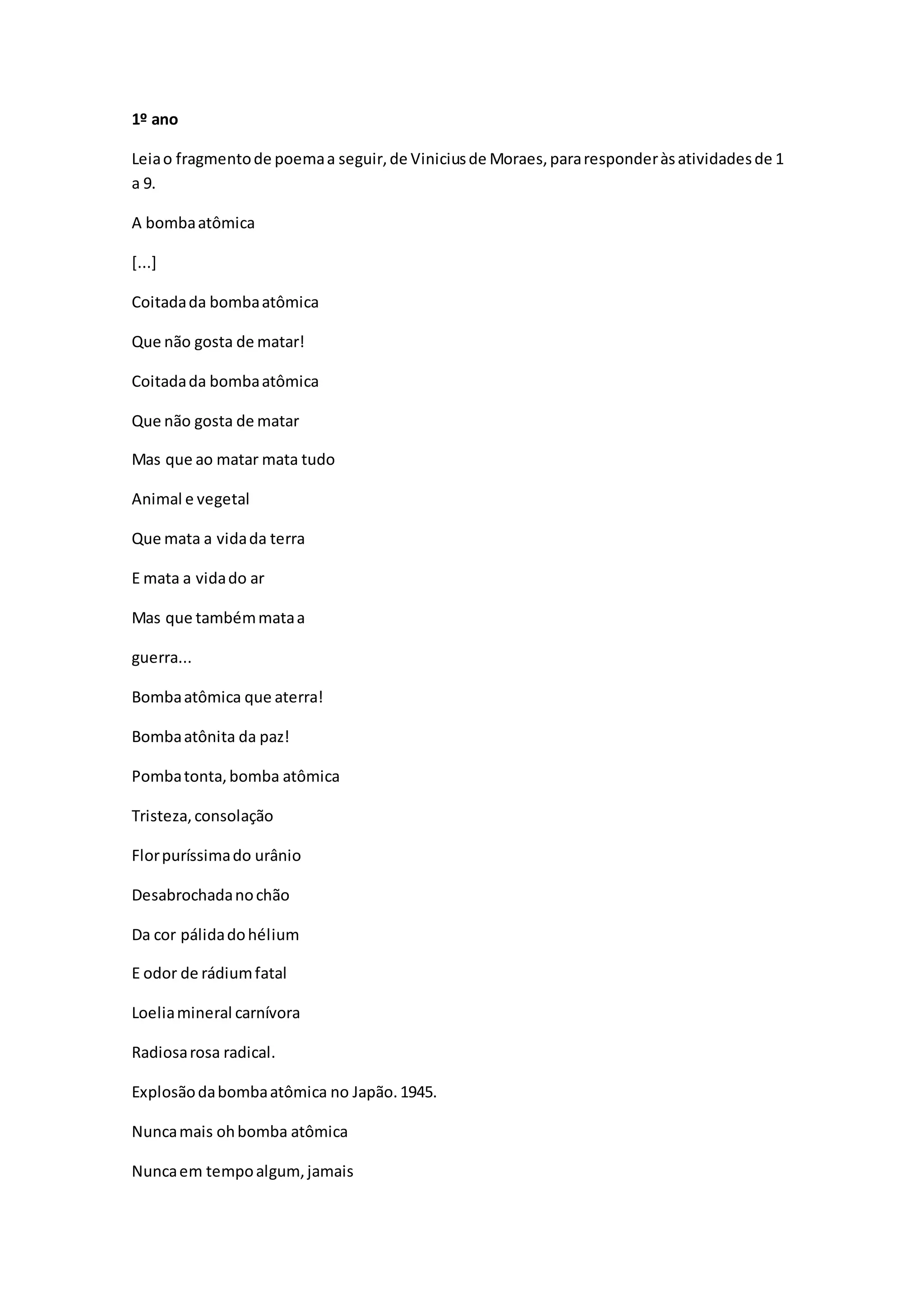 O poema descreve os efeitos devastadores da bomba atômica lançada sobre Hiroshima em 1945, personificando-a como uma vítima forçada a matar contra sua vontade, mas que também acaba matando a guerra. A bomba é vista como um símbolo ambíguo de destruição e esperança de paz.