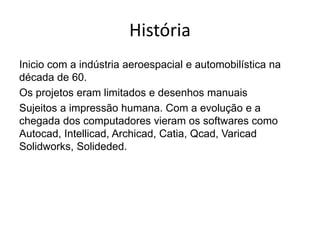 O documento discute o CAD (Computer Aided Draft), que é desenho projetado por computador utilizado em engenharia, arquitetura e outros campos. Brevemente descreve a história do CAD desde sua origem na década de 1960 até softwares atuais como AutoCAD. Apresenta também os principais comandos do AutoCAD 2D para criação de formas geométricas e objetos.