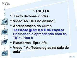 O documento apresenta um curso sobre tecnologias na educação, conduzido pela formadora Mônica Cristina, com foco na integração das tecnologias no ensino e na formação de uma comunidade de prática entre educadores. O curso, com duração de 100 horas, abordará as aplicações pedagógicas das TIC, promovendo a reflexão sobre o papel da tecnologia na aprendizagem e na construção do conhecimento. Inclui unidades temáticas sobre a sociedade digital, práticas pedagógicas e a utilização de mídias digitais, com atividades presenciais e a distância.