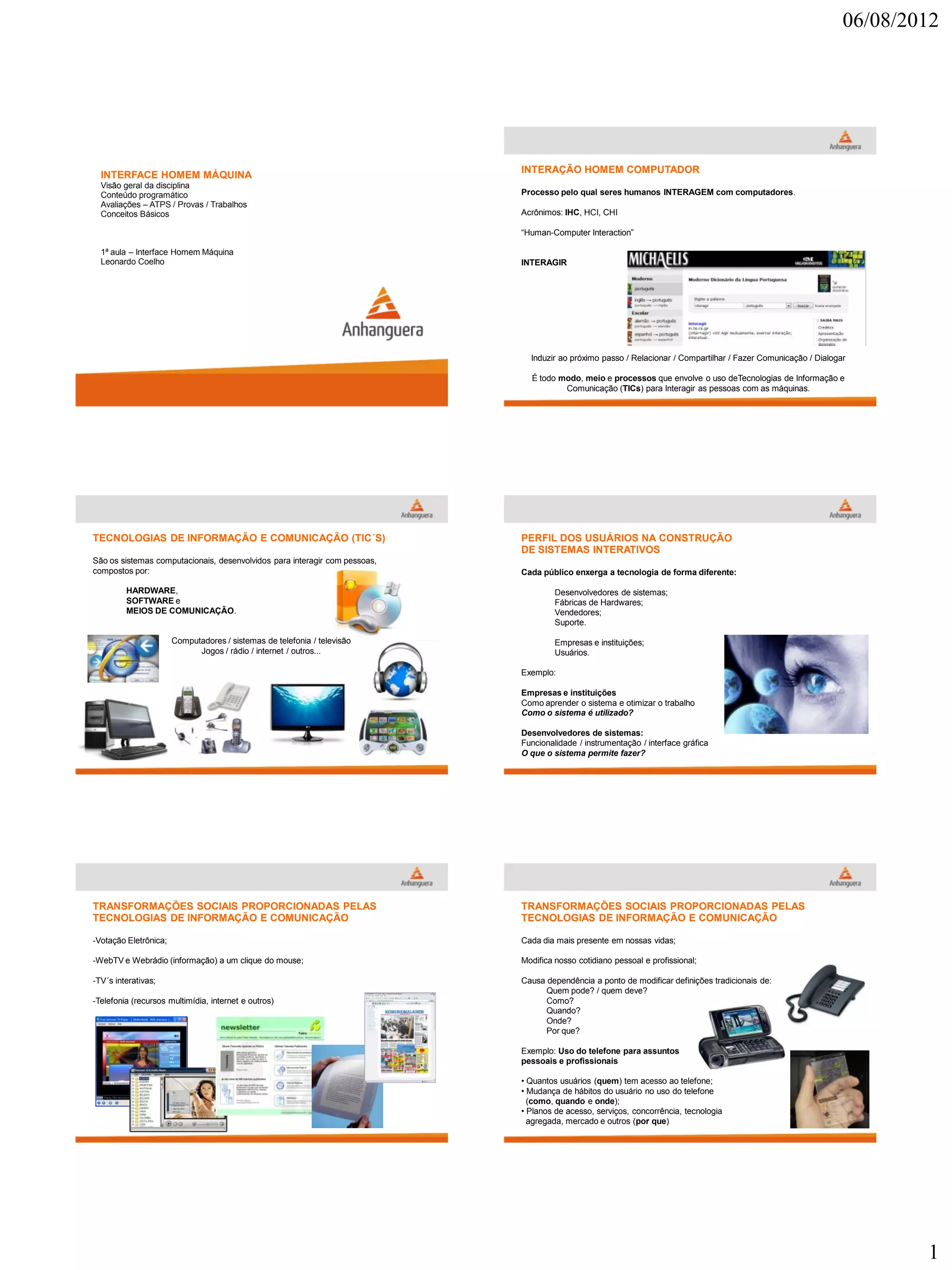 O documento discute a interface homem-computador e como as pessoas interagem com sistemas computacionais. Em três frases, resume: (1) A interface homem-computador permite que seres humanos interajam com computadores através de hardware, software e meios de comunicação; (2) As tecnologias de informação e comunicação transformaram o cotidiano pessoal e profissional e como as pessoas usam, aprendem e se comunicam com sistemas; (3) A interface gráfica representa sistemas visulamente usando elementos como imagens, textos e