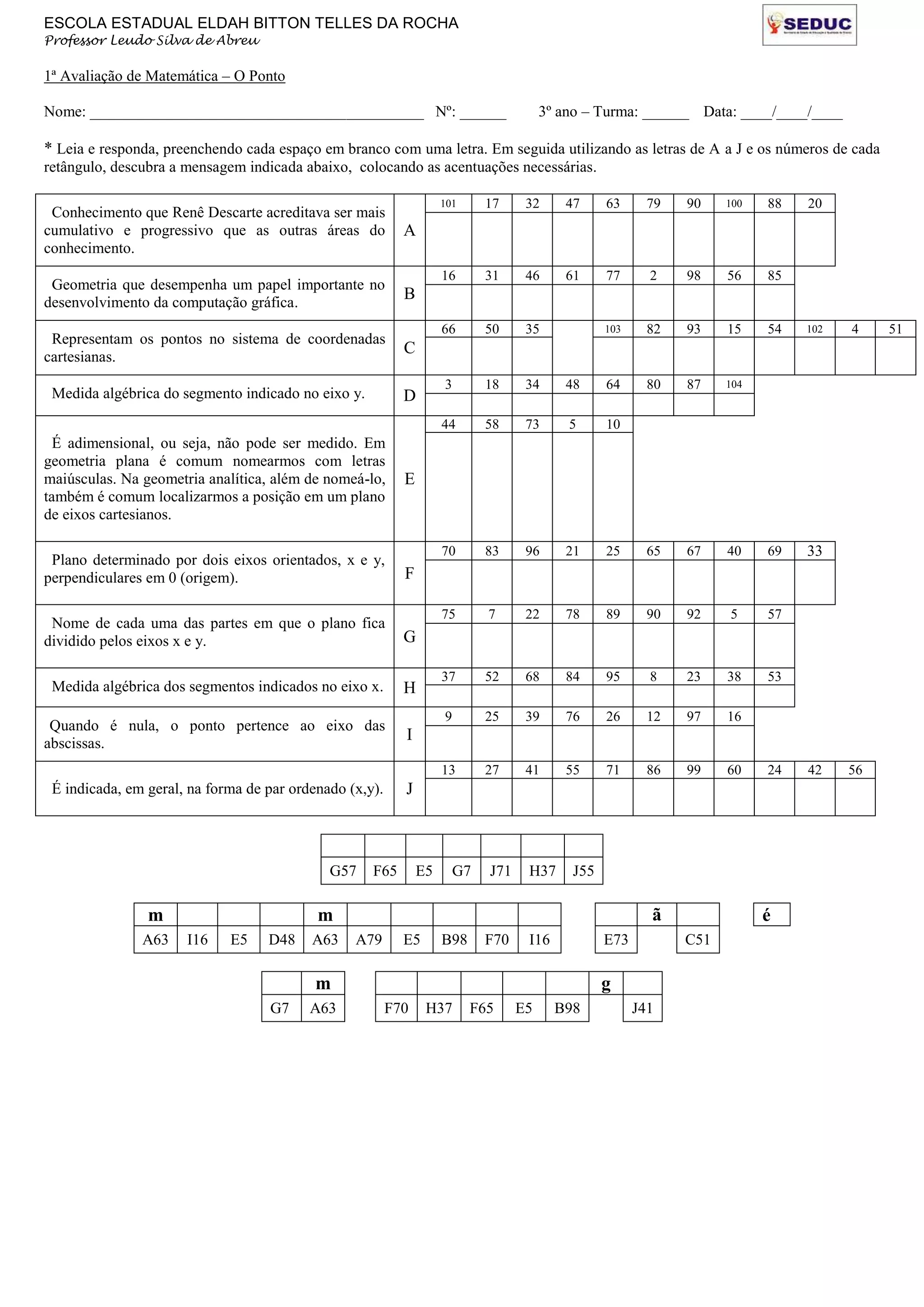 * Leia e responda, preenchendo cada espaço em branco com uma letra. Em seguida utilizando as letras de A a J e os números de cada