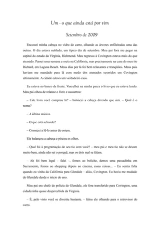 O documento é um resumo do capítulo 1 de um livro. Ele descreve a volta do narrador para casa após passar férias na Califórnia com seu tio, quase sofrendo um acidente no caminho. Ao chegar em casa, é recebido calorosamente por sua mãe, mas a casa está vazia sem explicação.