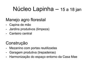 A caravana Ecovida ocorrerá de 15 a 25 de janeiro de 2010 e envolverá atividades de manejo agroflorestal, jardinagem, construção e design em três núcleos diferentes: Lapinha, Moeda e Gamarra. As atividades incluem capina, plantio de árvores, construção de mezanino e adobe, e zoneamento do terreno.