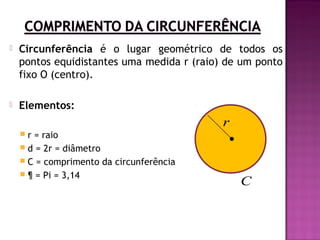 O documento apresenta os conceitos básicos de circunferência, incluindo sua definição geométrica, elementos como raio, diâmetro e comprimento, a fórmula para calcular o comprimento da circunferência e a relação entre ângulo central e comprimento do arco. Também mostra como resolver exercícios utilizando essas fórmulas e conceitos, como calcular o comprimento de um arco de 60° de uma circunferência de 21 cm de raio.