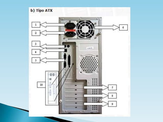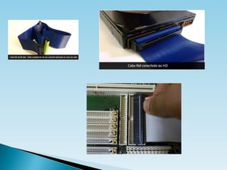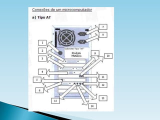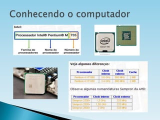 O documento explora a estrutura e funcionalidade dos computadores, incluindo detalhes sobre gabinetes, conectores, placas-mãe, fontes de alimentação e cabos de conexão. Também descreve diferentes tipos de processadores e barramentos, destacando suas respectivas velocidades e capacidades. Informações técnicas sobre a instalação de periféricos e o funcionamento interno dos componentes são abordadas de maneira detalhada.