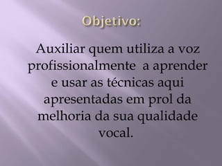 Auxiliar quem utilizaa voz profissionalmente a aprender e usar as técnicas aqui apresentadas em prol da melhoria da sua qualidade vocal.