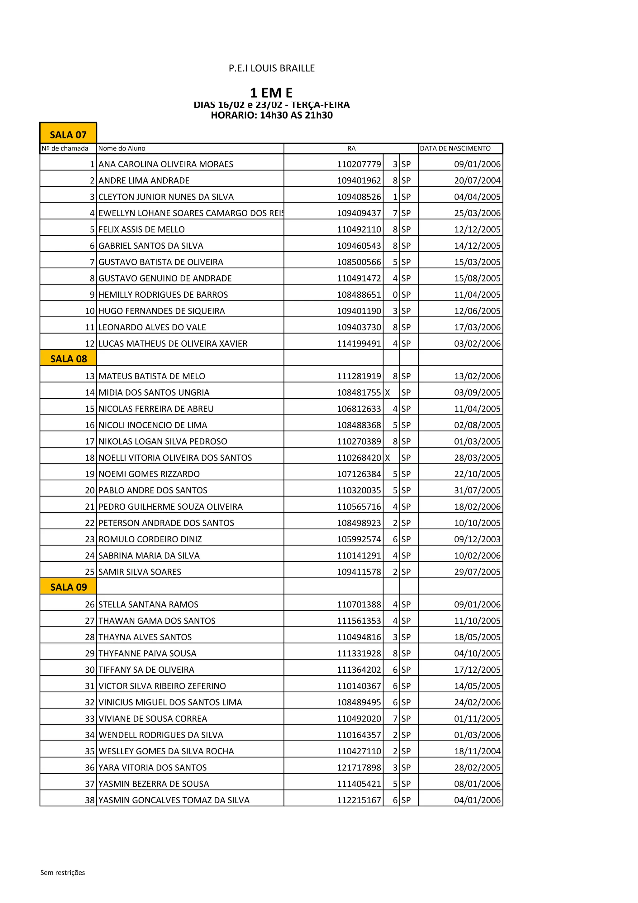 O documento lista os nomes e datas de nascimento de 38 alunos divididos em 3 salas de aula. Também fornece informações sobre um curso de capacitação em libras marcado para duas terças-feiras em fevereiro com horário das 14h30 às 21h30 e sem restrições.