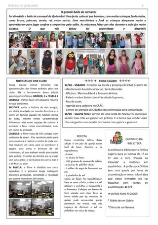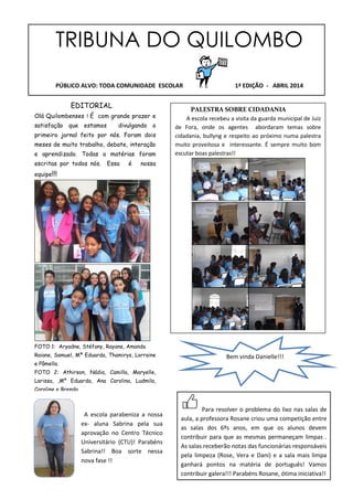 O documento resume as principais atividades e notícias da Escola Municipal Quilombo dos Palmares no mês de abril de 2014. A escola recebeu uma palestra sobre cidadania da Guarda Municipal e realizou um baile de carnaval. Alunos produziram textos, desenhos e poesias sobre temas como O Patinho Feio e células. A escola também promoveu atividades do Cine Clube e CRAS.
