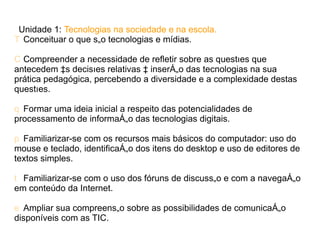 Este documento descreve oito unidades de um curso sobre tecnologias na educação. As unidades cobrem tópicos como navegação na internet, blogs, edição de texto, planilhas eletrônicas e cooperação online. O objetivo geral é capacitar professores a integrar tecnologias de comunicação e informação em suas práticas pedagógicas.