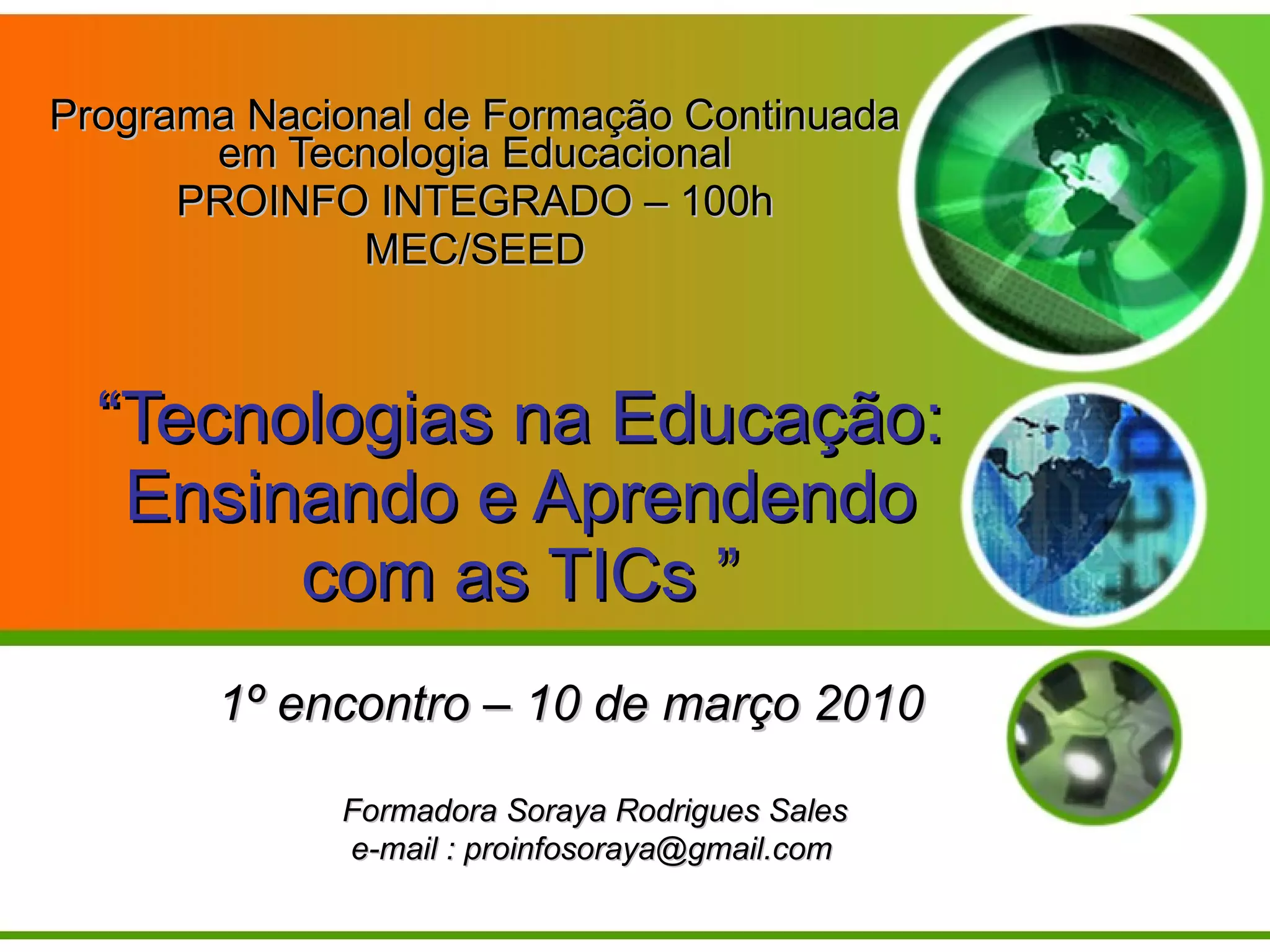 O documento descreve o primeiro encontro de um curso de formação continuada para professores sobre tecnologias educacionais. Apresenta os objetivos do curso, que são ensinar professores a usar tecnologias para aprimorar o ensino e a aprendizagem de estudantes, o cronograma e as atividades, incluindo leituras e discussões sobre o papel da tecnologia na educação.