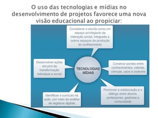 O documento discute como o uso de tecnologia na educação deve estar integrado a um projeto pedagógico com o objetivo de desenvolver habilidades de pensamento. Ele também descreve como a abordagem construcionista através de projetos permite que os alunos aprendam fazendo e reconheçam sua autoria. Por fim, ressalta que projetos interdisciplinares potencializam a articulação de saberes e a compreensão de problemas reais.