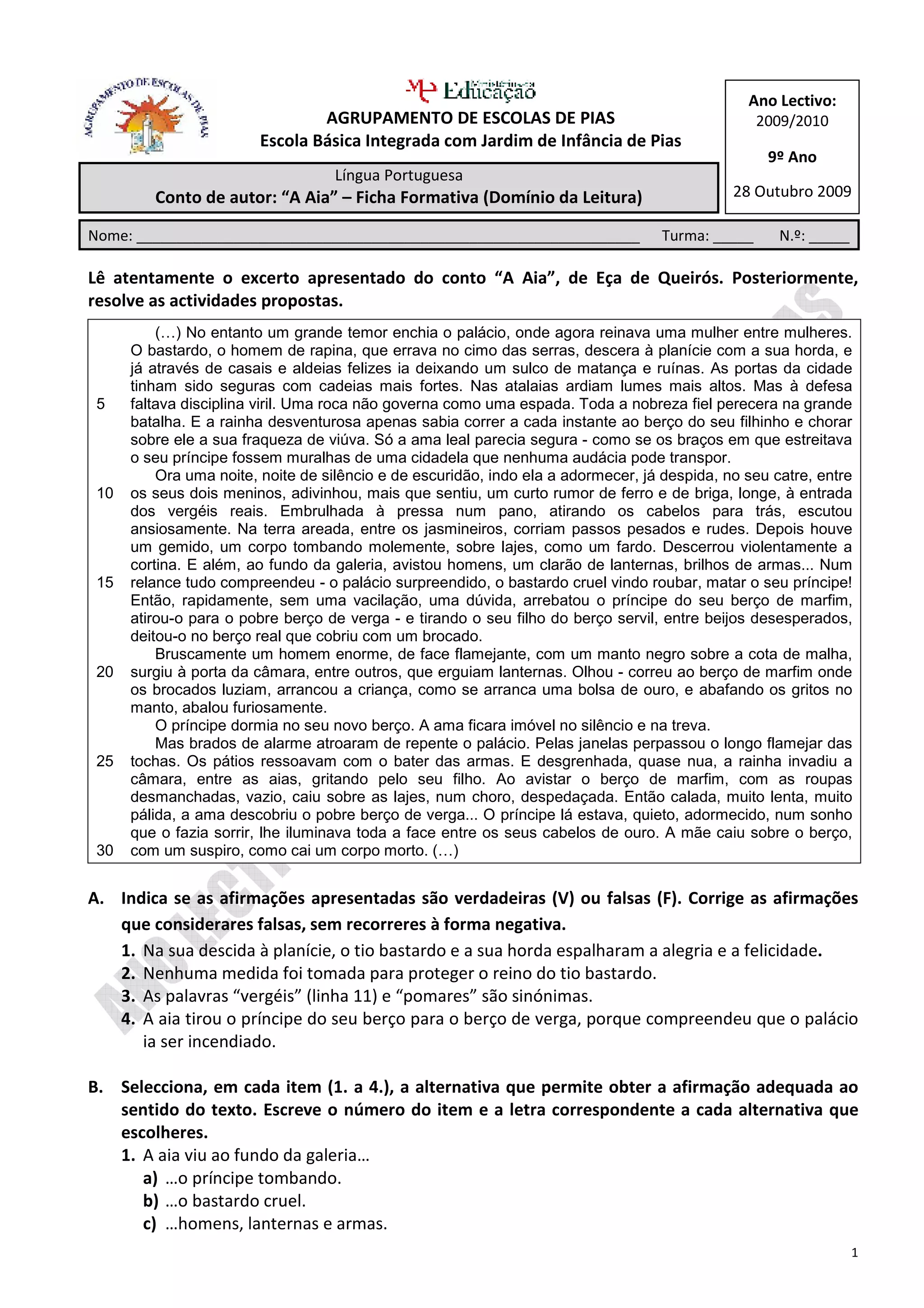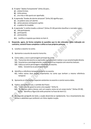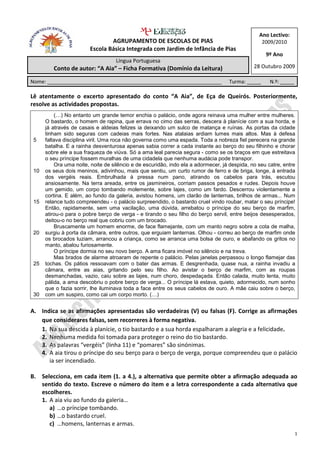 O documento apresenta um excerto do conto "A Aia", de Eça de Queirós, que descreve o momento em que a aia salva o príncipe de ser raptado pelo tio bastardo durante uma invasão ao palácio real. A aia troca o príncipe do seu berço nobre para o berço humilde, enganando assim o raptor. Quando a verdade é descoberta, a rainha desfalece de alívio por o filho estar a salvo.