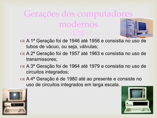 O documento descreve as primeiras gerações de computadores, incluindo os computadores da primeira geração como o Mark I, ENIAC e UNIVAC. Estes primeiros computadores usavam válvulas eletrônicas e eram muito grandes, pesados e lentos comparados aos de hoje.