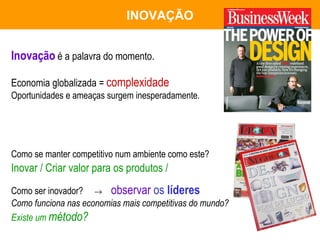 1) O documento discute a importância da inovação e do design para o desenvolvimento de produtos competitivos.