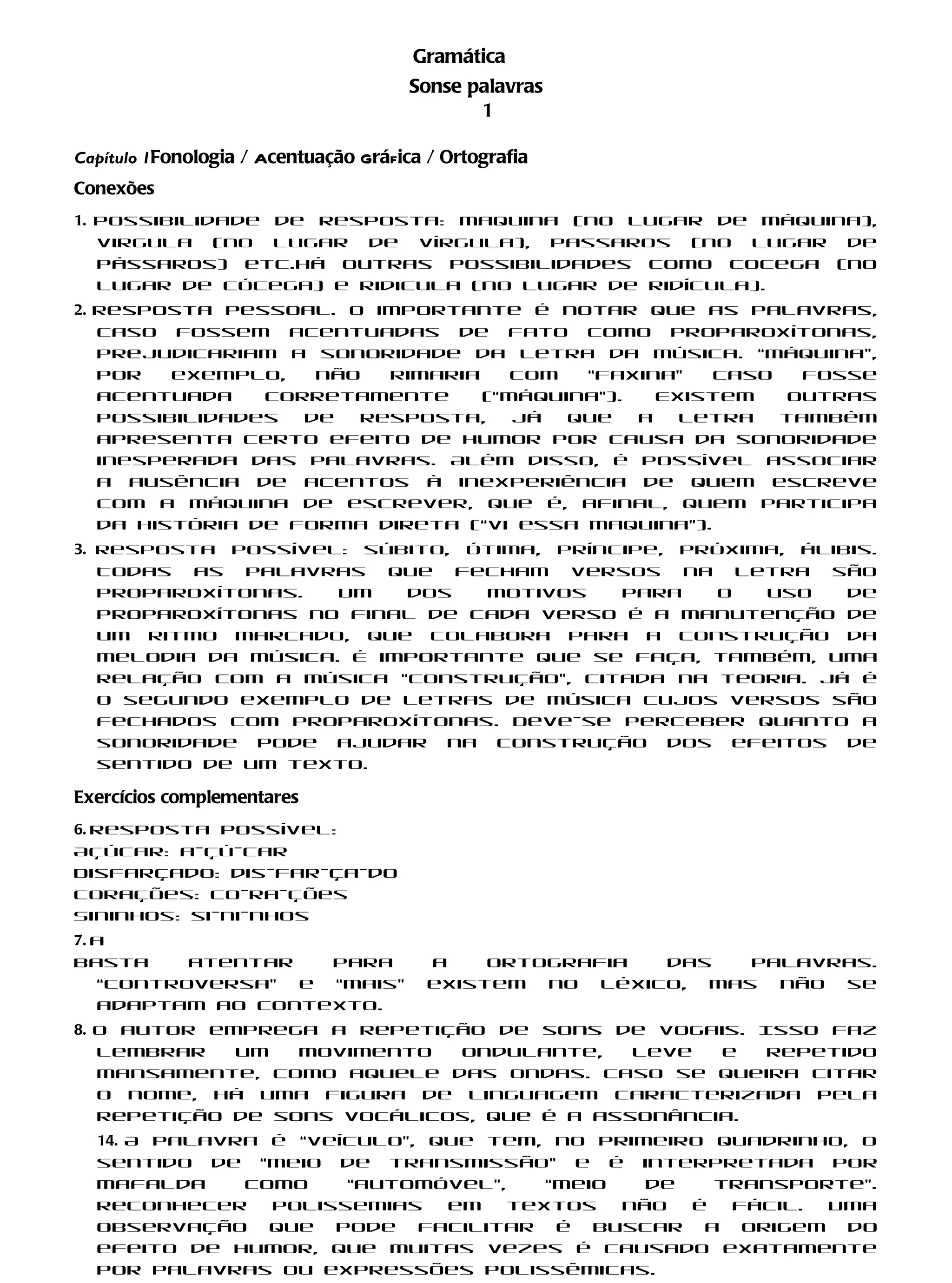 O documento discute pontos gramaticais como fonologia, acentuação e ortografia. Apresenta possíveis respostas para exercícios sobre esses tópicos e discute como a sonoridade das palavras pode influenciar a construção de versos musicais.