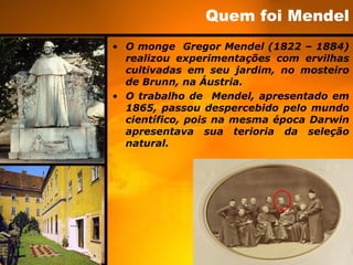 O documento descreve o trabalho pioneiro de Gregor Mendel com ervilhas, que estabeleceu as leis da hereditariedade. Mendel realizou cruzamentos controlados entre variedades de ervilhas e observou que os caracteres se transmitiam de geração em geração de forma previsível. Sua descoberta dos princípios básicos da genética passou despercebida por décadas, até ser reconhecida no início do século XX como fundamento da genética clássica.