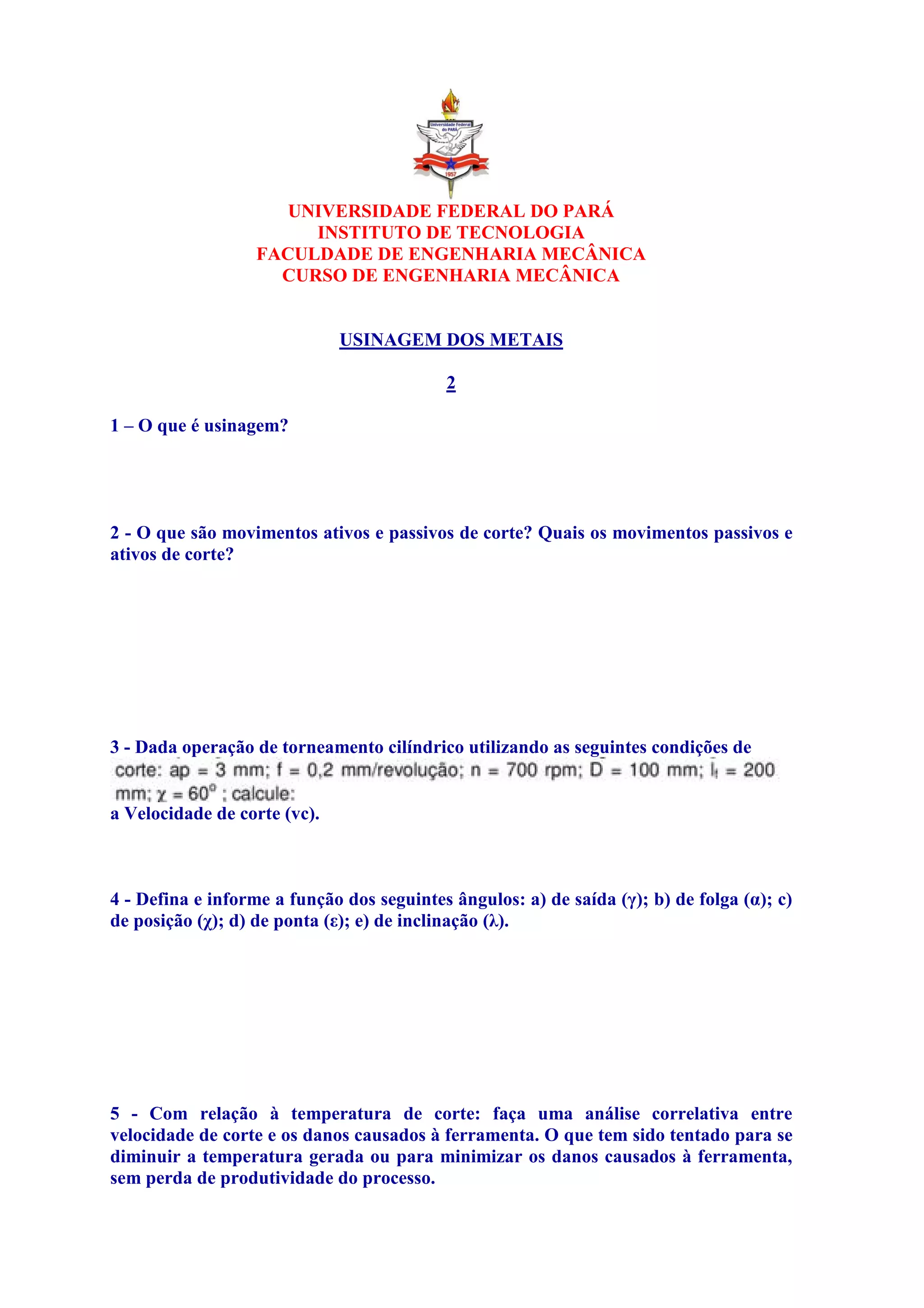 O documento discute conceitos de usinagem dos metais, incluindo definições de movimentos ativos e passivos de corte, cálculo de velocidade de corte, funções de ângulos de ferramentas, efeitos da temperatura de corte, função de fluidos de corte, fatores para seleção de fluidos de corte, desvantagens do uso de fluidos de corte e alternativas, diferença entre aferição e calibração, subdivisões de um sistema de medições, métodos básicos de medição, instrumentos de medição, propried