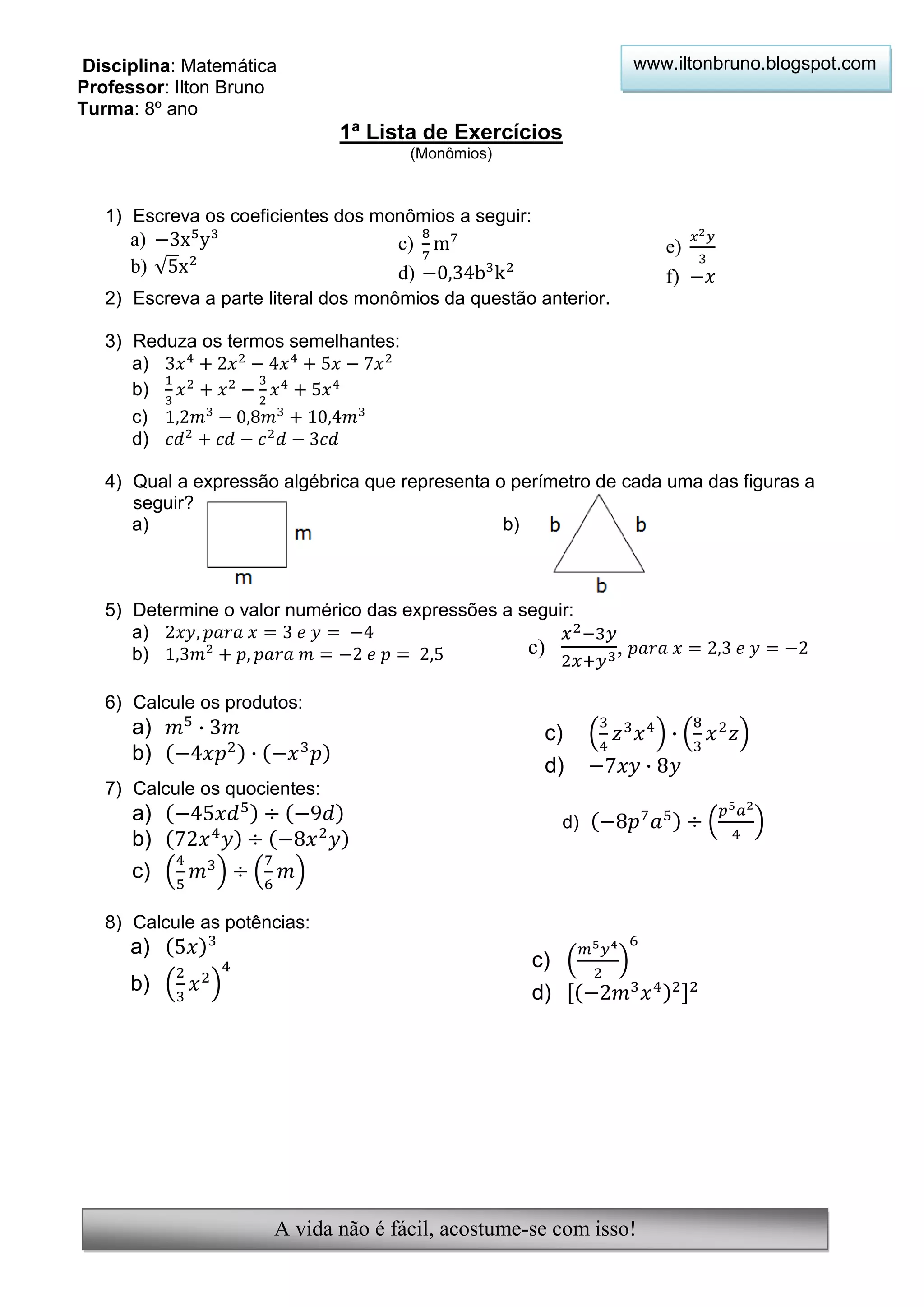 1) O documento é uma lista de exercícios de matemática sobre monômios para o 8o ano. A lista contém 8 questões sobre coeficientes de monômios, redução de termos semelhantes, perímetro de figuras, valor numérico de expressões, produtos, quocientes e potências.